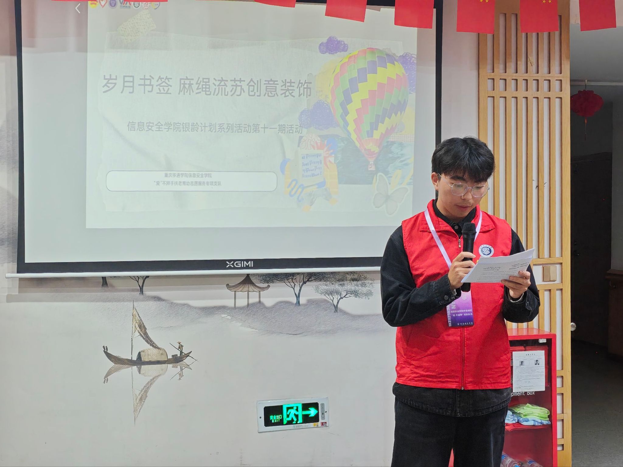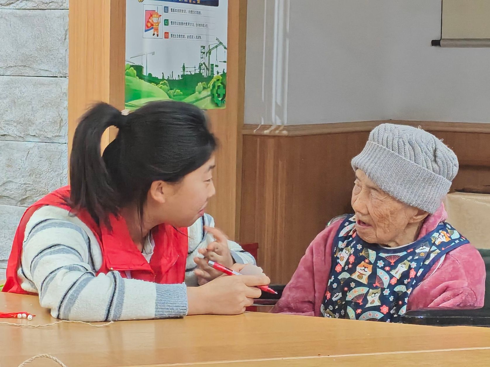 活动伊始,志愿者与老人们聊聊日常,嘘寒问暖,与老人们拉进了距离,现场一片温馨。紧接着由主持人向老人们展示麻绳布艺书签成品并介绍麻绳特性,讲解制作技巧。