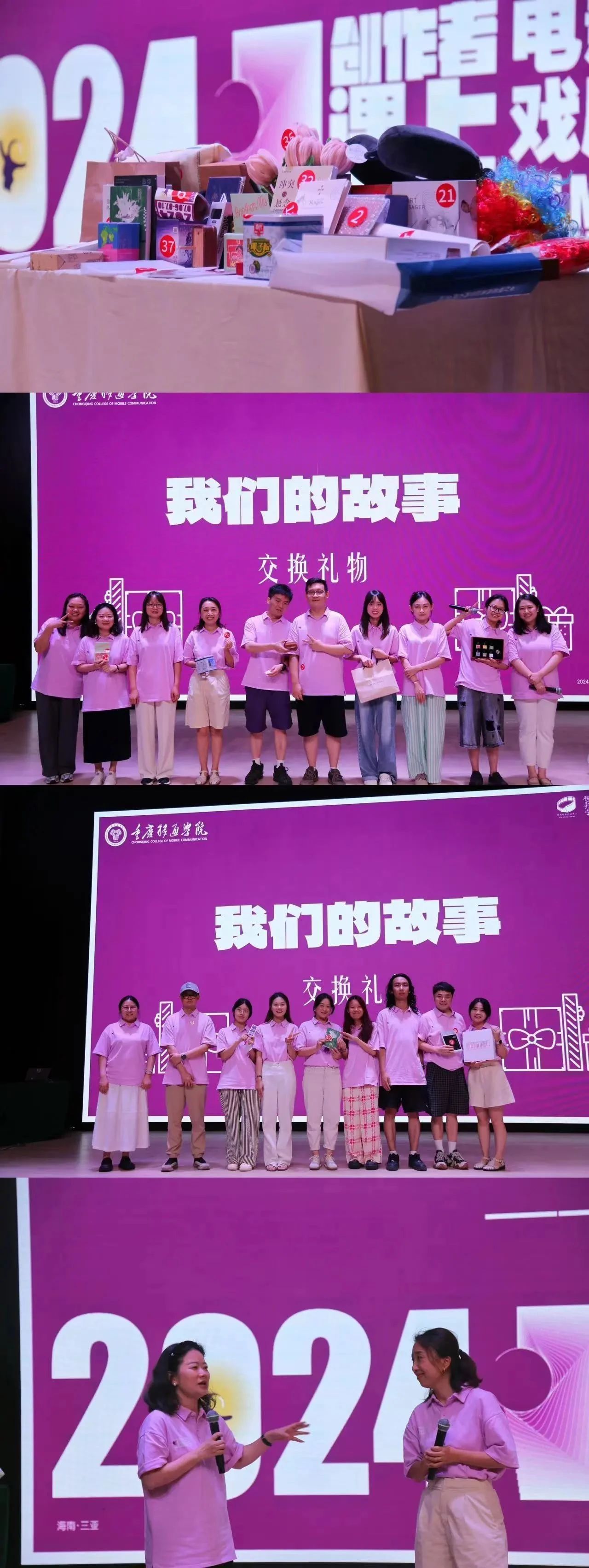 第二个环节中,由电影评论中心的梁冬梅老师主持组织两部门全体教师进行了有趣的礼物交换。在每一个小小的礼物背后都有一个温暖的故事,不管是戏剧影视学院秦琦琅老师亲手制作的胶片摆件,还是电影评论中心幸李寒老师从奥斯卡颁奖礼带回的小金人巧克力,都是老师们在移通与光影的故事。最后电影评论中心彭可主任带来了由她翻译的著作《超越英雄之旅》,戏剧影视学院王芳院长也带来了学生亲手绘制的丝巾,给交换礼物环节画上了圆满的句号。