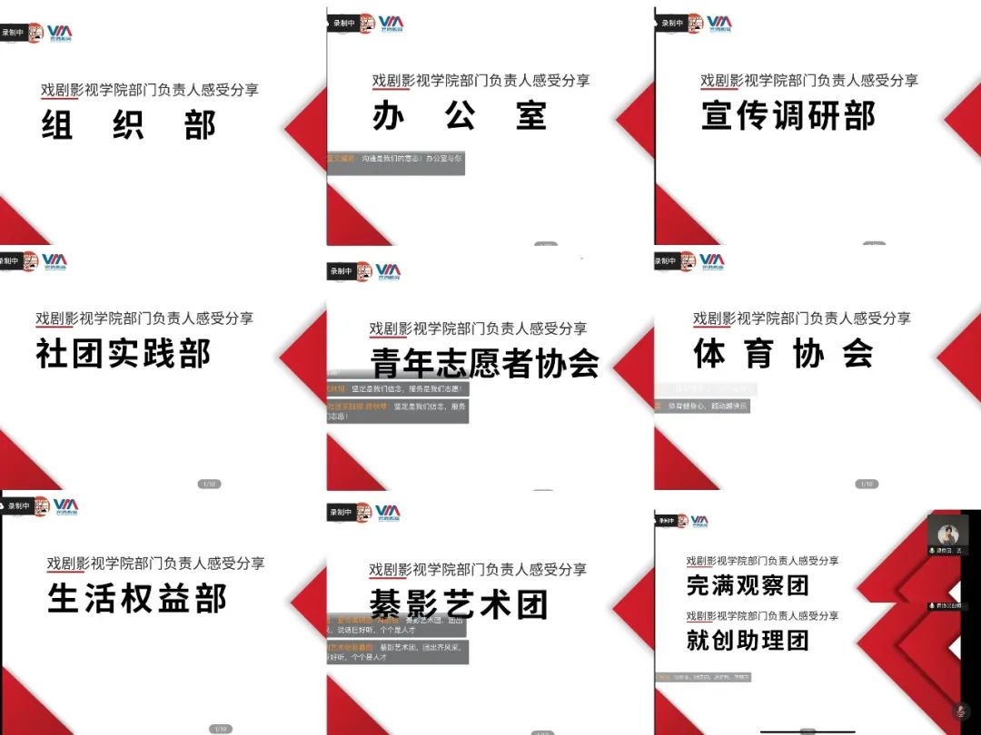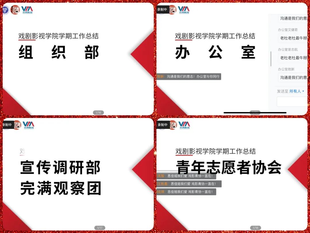 时光飞逝,转眼间期末已至,在忙忙碌碌中,一学期的工作迎来了最后的尾声。一学期以来,我们有过迷茫,有过后悔,有过收获,也有过感动,在学生组织的工作中,我们共同度过了风风雨雨,共同分享了累累硕果,留下了很多美好的回忆。为总结好本学期的工作经验与成果,同时更好地促进下学期学生组织部门工作的推进,2022年12月22日中午12:30-14:00,戏剧影视学院一届一任学生组织2022—2023学年第一学期总结大会在腾讯会议召开,学工办主任曾玉娇老师、辅导员潘锐老师、各班导师以及戏剧影视学院学生组织全体干事参与会议。