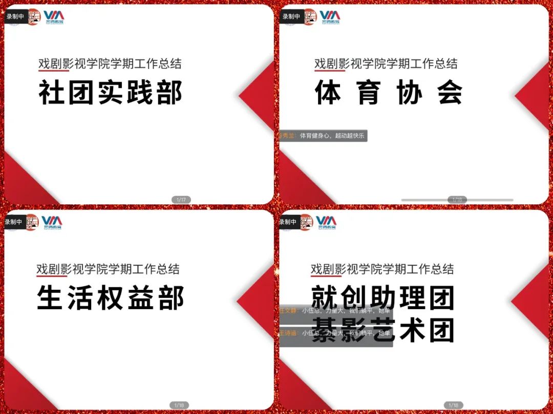 本学期,各部门在班导师的组织带领下,创造了一个又一个惊喜和奇迹。本次总结大会,各位班导师和部门临时负责人依次对部门工作进行总结复盘,对于举办过的活动与参与过的工作进行再次回顾,既从中分析工作的不足,也从中汲取到对未来的经验,同时对于部门的风采和成绩以及成员的优秀表现做出客观评价,肯定了大家的努力,也指出不足之处,并对下学期的工作提出计划与安排,各部门都表示要积极奉献自己的才华与智慧,竭尽全力的为戏剧影视学院的建设添砖加瓦。