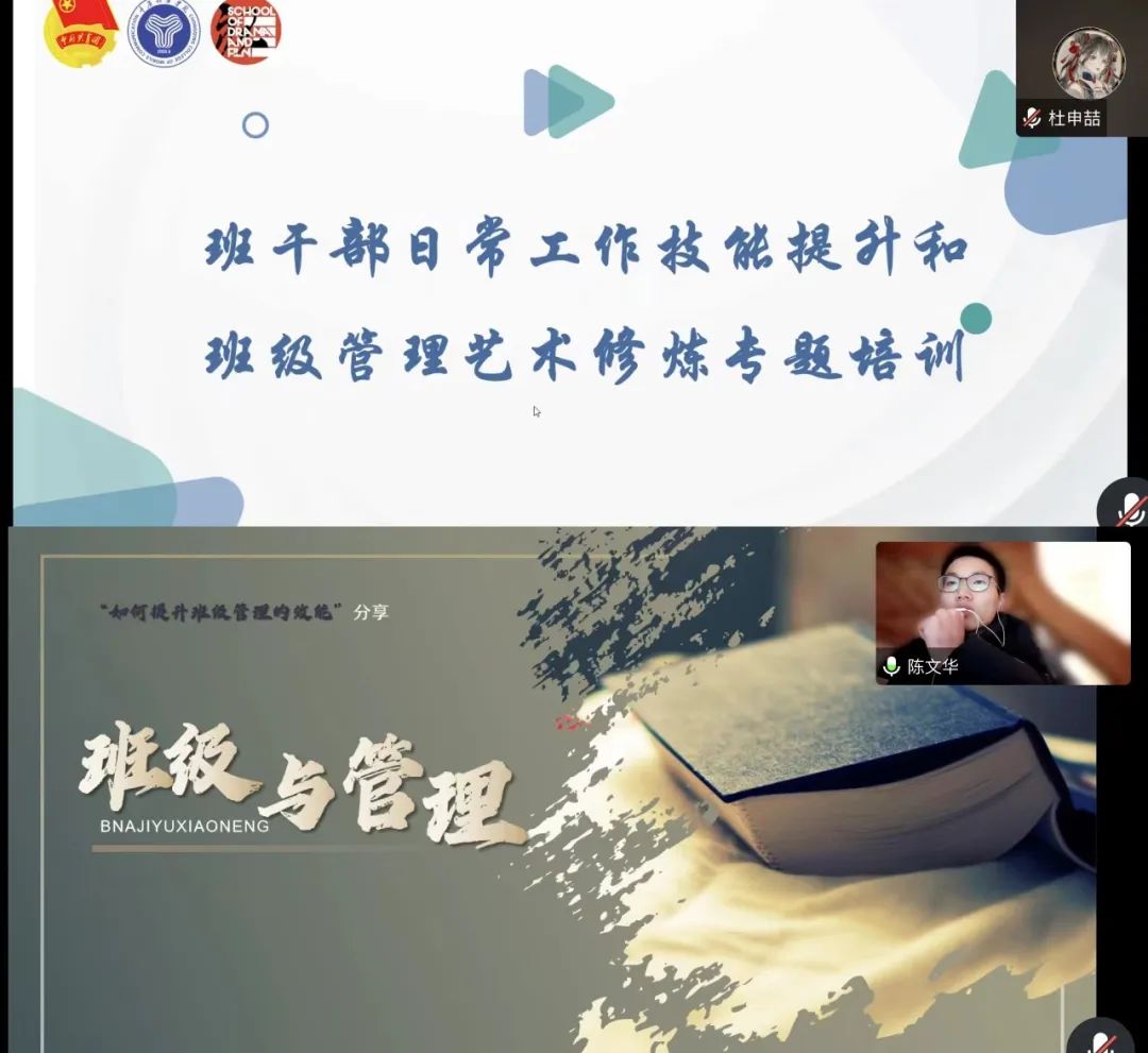为进一步加强班级建设,提升班委干部班级服务与管理水平,切实发挥班委会和班干部的作用,充分调动其工作积极性,保证新学期班级工作有条不紊地进行,2023年2月11日上午10点,戏剧影视学院班干部日常工作技能提升与班级管理艺术修炼系列培训第二期腾讯会议如期开展,本期培训会邀请到淬炼·国际商学院文创部部长、戏剧影视学院2022级动画1-3班班导师陈文华学长为大家分享其在班级服务方面的特别经验,本期培训由2022级动画2班殷瑞主持。