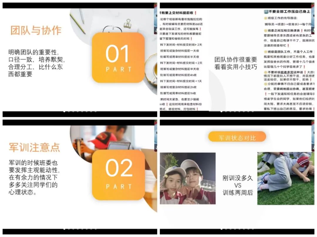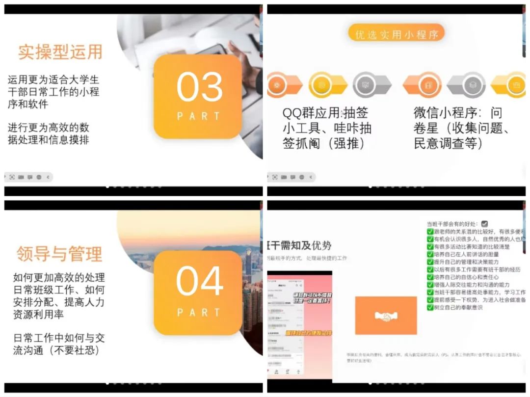 第三次的培训同样让我收获到了很多,学姐给我们分享了许多小妙招还有很多她给我们的经验和建议。首先,与我们讲了一些实用的小软件,可以帮助我们更快的更高效的完成我们的工作。她还与我们分享了成为班干部的好处。然后讲了团队与协作,这一点也是很重要的,她分享了团队之间合作的方法、明确了团队之间的分工以及与班级同学如何沟通协调等等。她还给我们整理了很多的实用小技巧,我们这个还不成熟的团体提供了很好的帮助。很感谢学姐这次的分享!