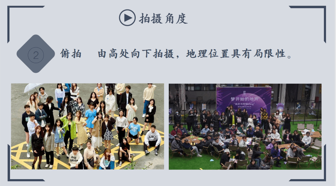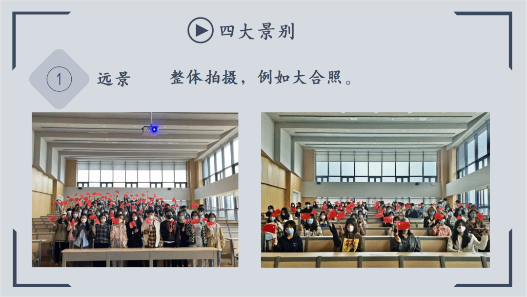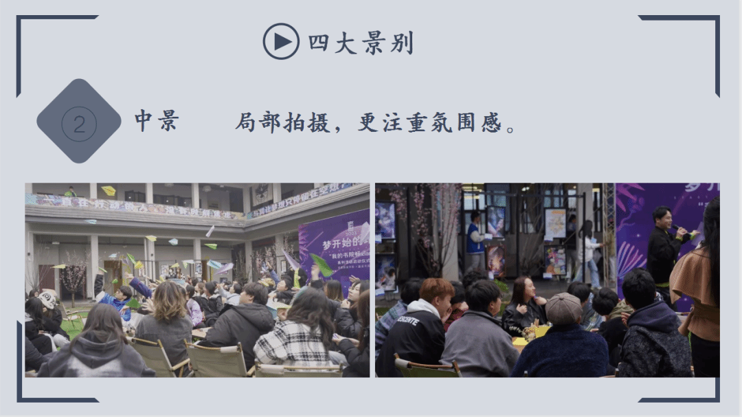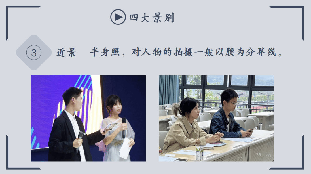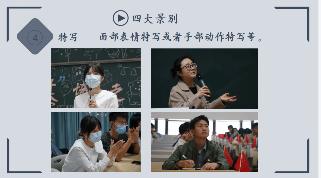 最后,关于四大景别,黄于芮学姐指出了景别的两大调整方式:摄影师移动位置或者拉动焦距,通过结合实际照片讲解了不同景别的适用范围和其独特的呈现效果,并强调要根据实际所需进行选择和融会贯通。