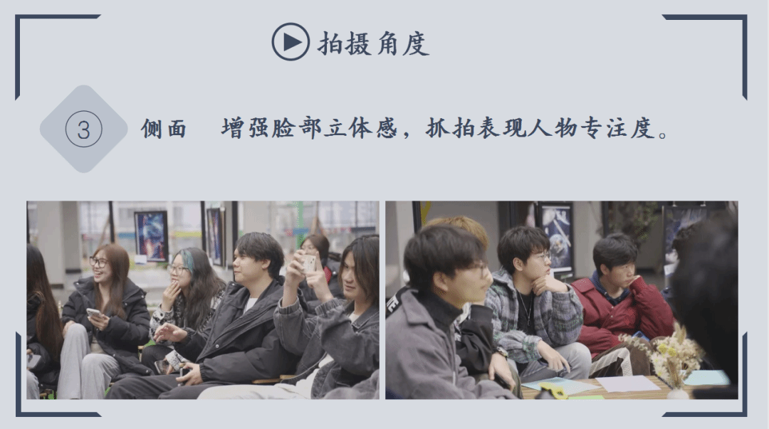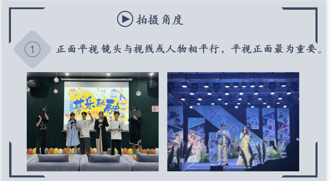接着,在拍摄角度方面,黄于芮学姐结合现实情况对不同的拍摄角度进行演示,全面阐述了不同角度拍摄的利弊,并结合学院的活动照片进行一一例举分析,提出要注意多角度拍摄,镜头与视线或人物相平行,平视正面是最为重要的,在活动中不管是对主持人、嘉宾、还是参与者,一定要保留各个角度的照片。