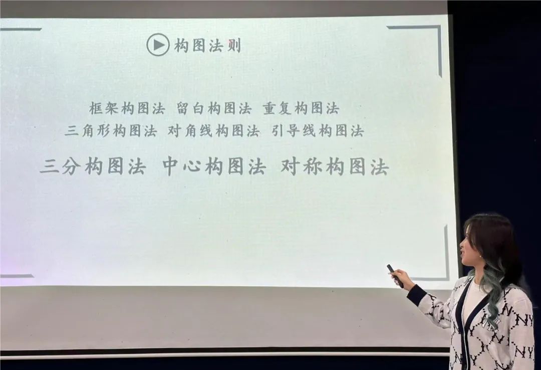 黄于芮学姐从构图法则、拍摄角度、四大景别三个部分对其进行分析讲解。首先针对构图方式,黄于芮学姐将其分为三分构图法、中心构图法、对称构图法三个方面,以一些实际照片为例,并结合PPT文字叙述对其进行分析讲解,最后总结出了一个中心要求——主体鲜明、横平竖直、四平八稳。