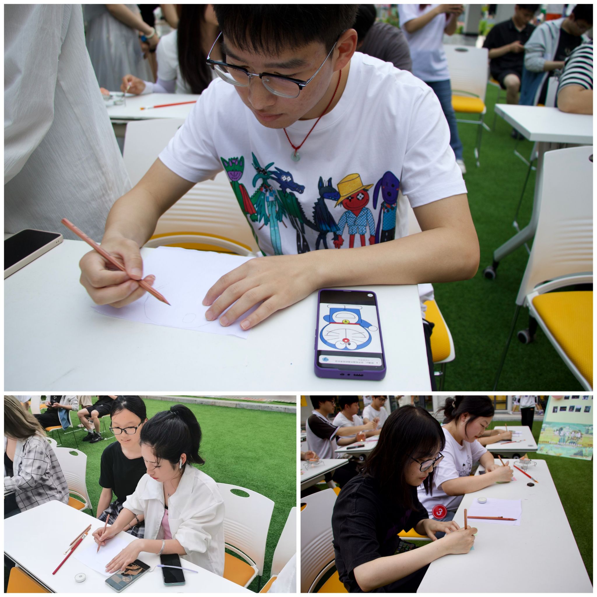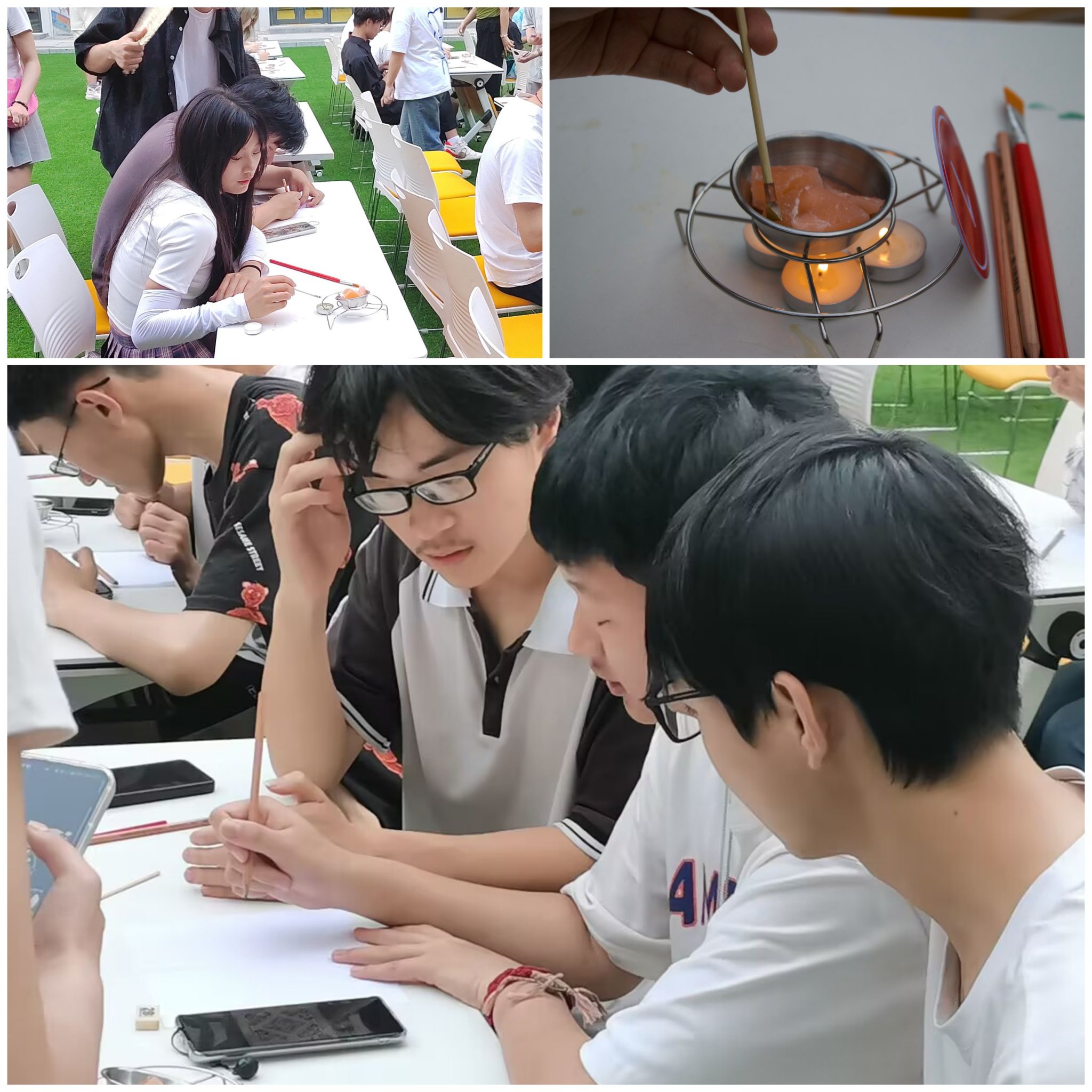 湘西蜡染是我国民间传统纺织印染手工艺,蜡染图案丰富、色调素雅,被誉为我国古代四大印花技艺。本次写生途中动画专业的同学们亲自动手制作过蜡染,涌现了很多优秀的作品,活动现场主持人向观众们展示了部分优秀蜡染作品,供大家欣赏观摩。同时为了让在场观众近距离体验蜡染手工艺,活动特意为观众们准备了蜡染DIY手工物料,从构思、打稿,再到绘图、涂蜡……随心绘制自己喜爱的图案,让大家亲自体验制作过程,增进对于湘西蜡染文化的了解和认识。