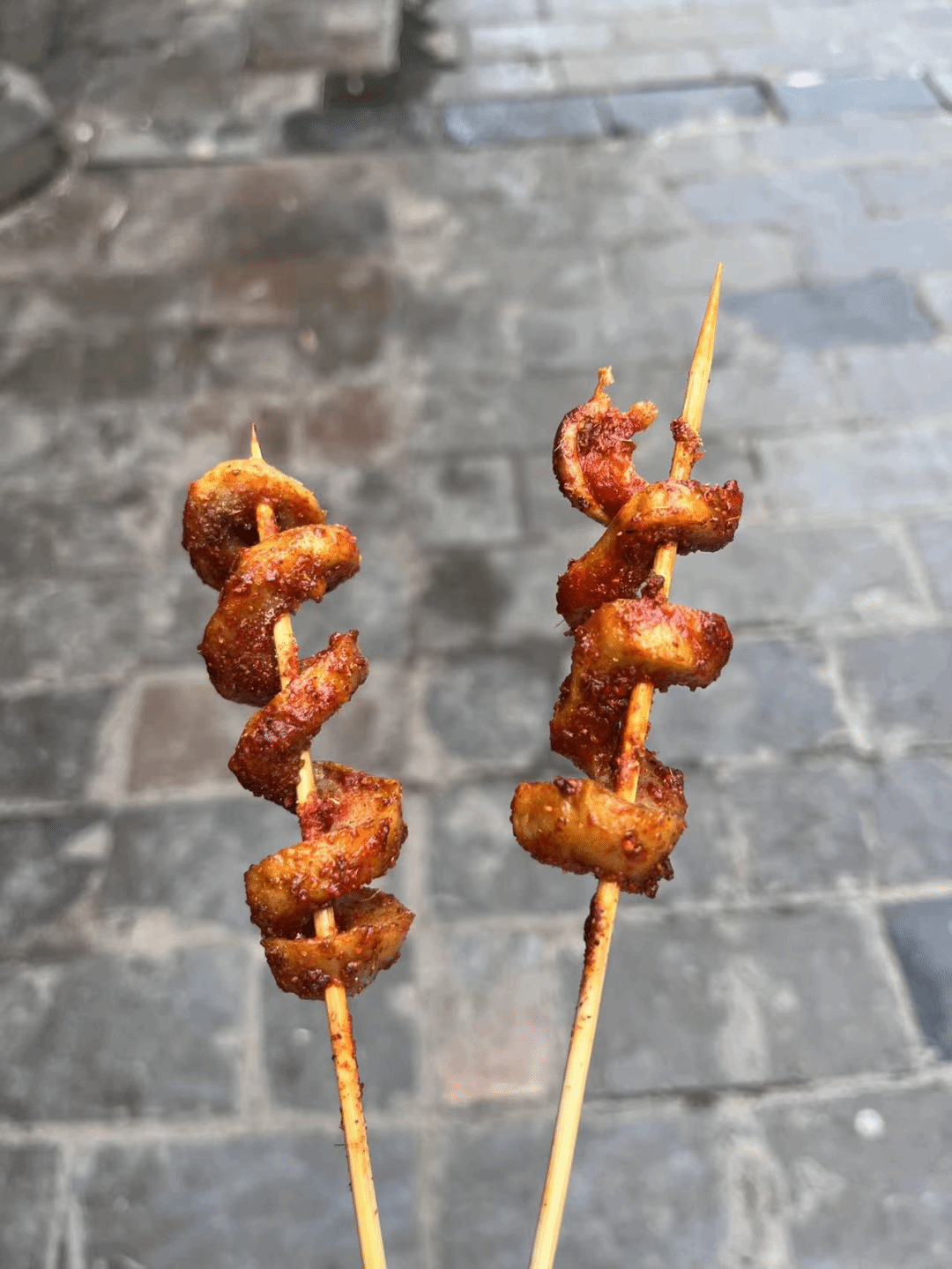 我们刚开始看见那个烤面筋摊子,我和朋友一起吃,刚开始买了一根,然后吃了我们就很好吃,不是很辣,意犹未尽。第二天买了两根吃的,鼻涕水辣的直流,我在那儿强装坚强,说一点都不辣,然后辣的蹦跳蹦跳的,最后我们要走了,然后我还去他们家借了个厕所。