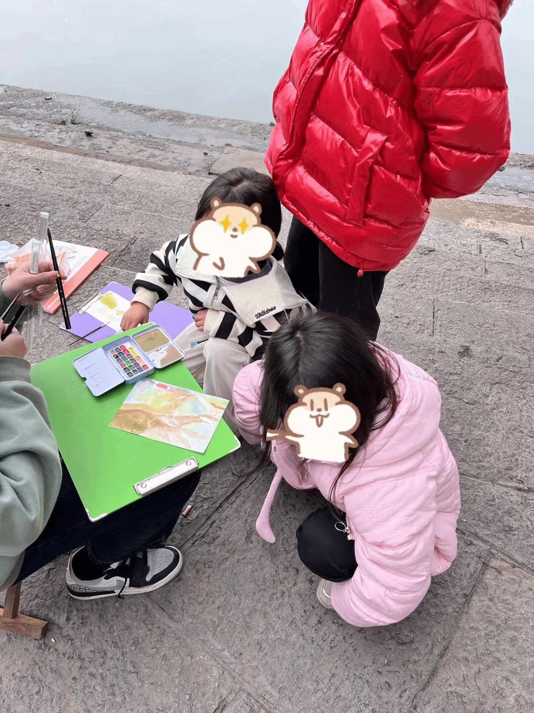 我们在边城最后一天的时候,我们走在写生的路上,准备走到那边那个河边去写生,然后有三个小妹妹就跟着我们,在我们屁股后面,在讨论什么话题,然后,什么什么,然后跟我们到了河边,然后一直跟着我们,然后就跟我们聊天,还在我们面前跳舞,我们教他画画,她们还去帮我们买水,然后我们请他吃了辣条,还带我们去看了看她们自己的学校,很有意思的三个小朋友。