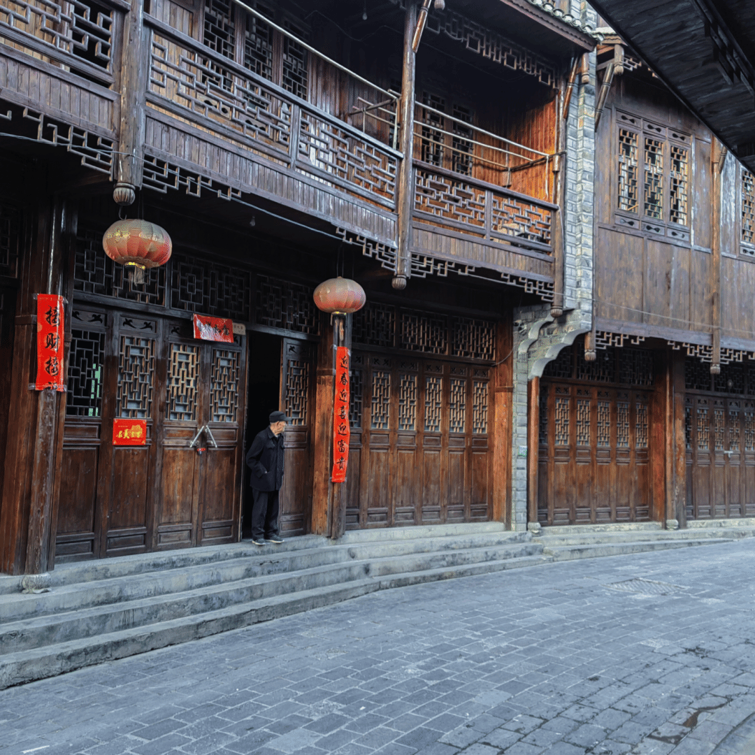寂静的边城在我们的到来下增添了几分热闹,在这热闹下有一扇门悄然打开,老人望着远去的嘈杂与 一尘不染的街道,或许是在回忆过年时的“杂乱”。