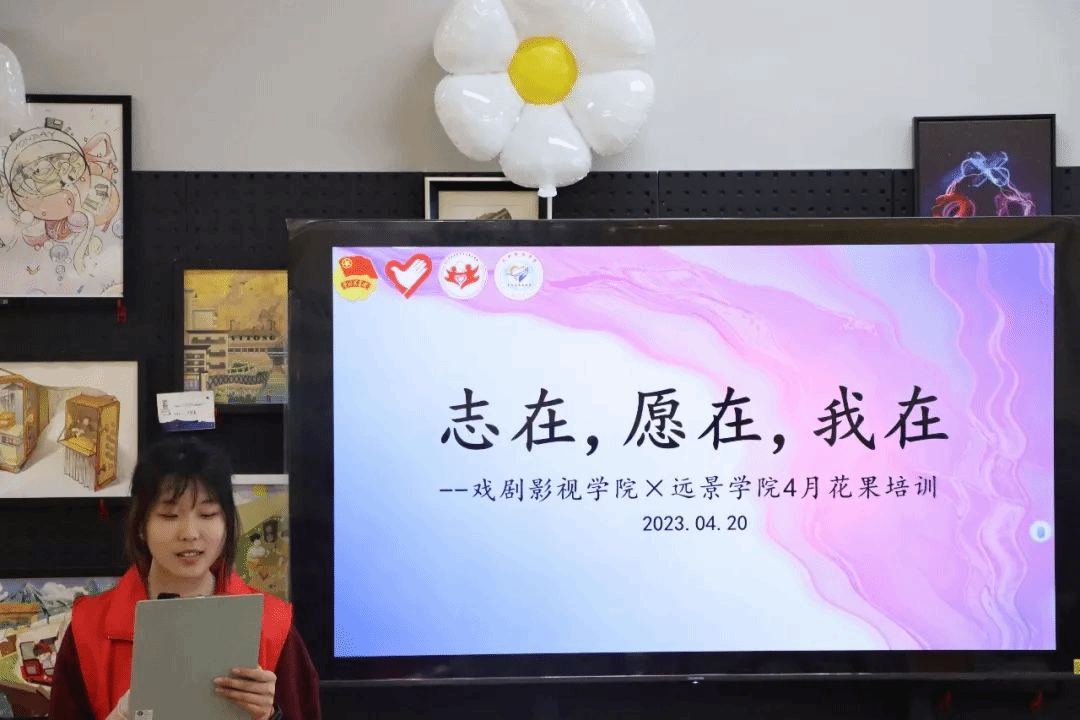 志愿服务作为我校完满教育四大版块之一,始终围绕“奉献、友爱、互助、进步”的精神理念搭建了一系列学生成长平台,助力学生在校园学习和校外实践中学会传递责任、表达态度。为提高大一年级志愿者对志愿服务的理解和认识,戏剧影视学院与远景学院青年志愿者协会于2023年4月20日中午12:30,在瀛溪书院YX3333非正式空间开展了以“志在,愿在,我在”为主题的花果培训,本次培训以“体系解读+项目分享+志愿访谈”的形式,面向戏影青协和远景青协全体志愿者开展学习交流。