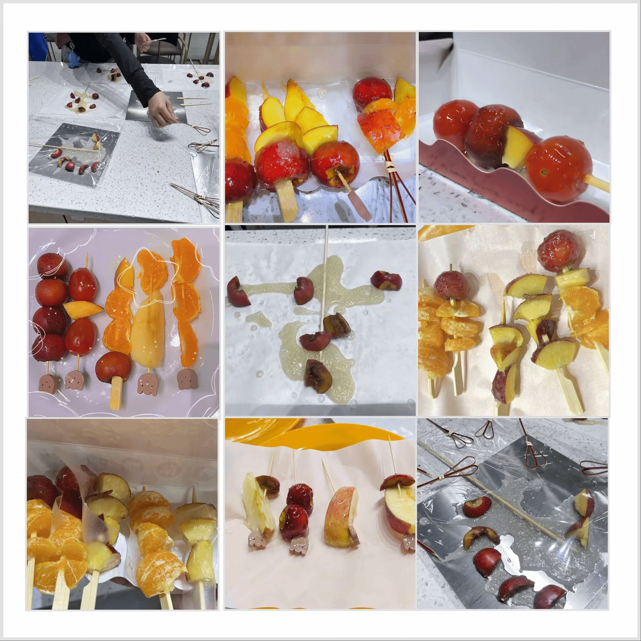 通过视频初步了解后同学们则按照兴趣分成两组进行,一组制作糖葫芦一组制作糖画,并且引用糖画转盘的方式来抽取材料,通过两次抽取机会来获得制作的元素,山楂、圣女果、橘子等活动材料静置在台上等待同学们挑选设计。