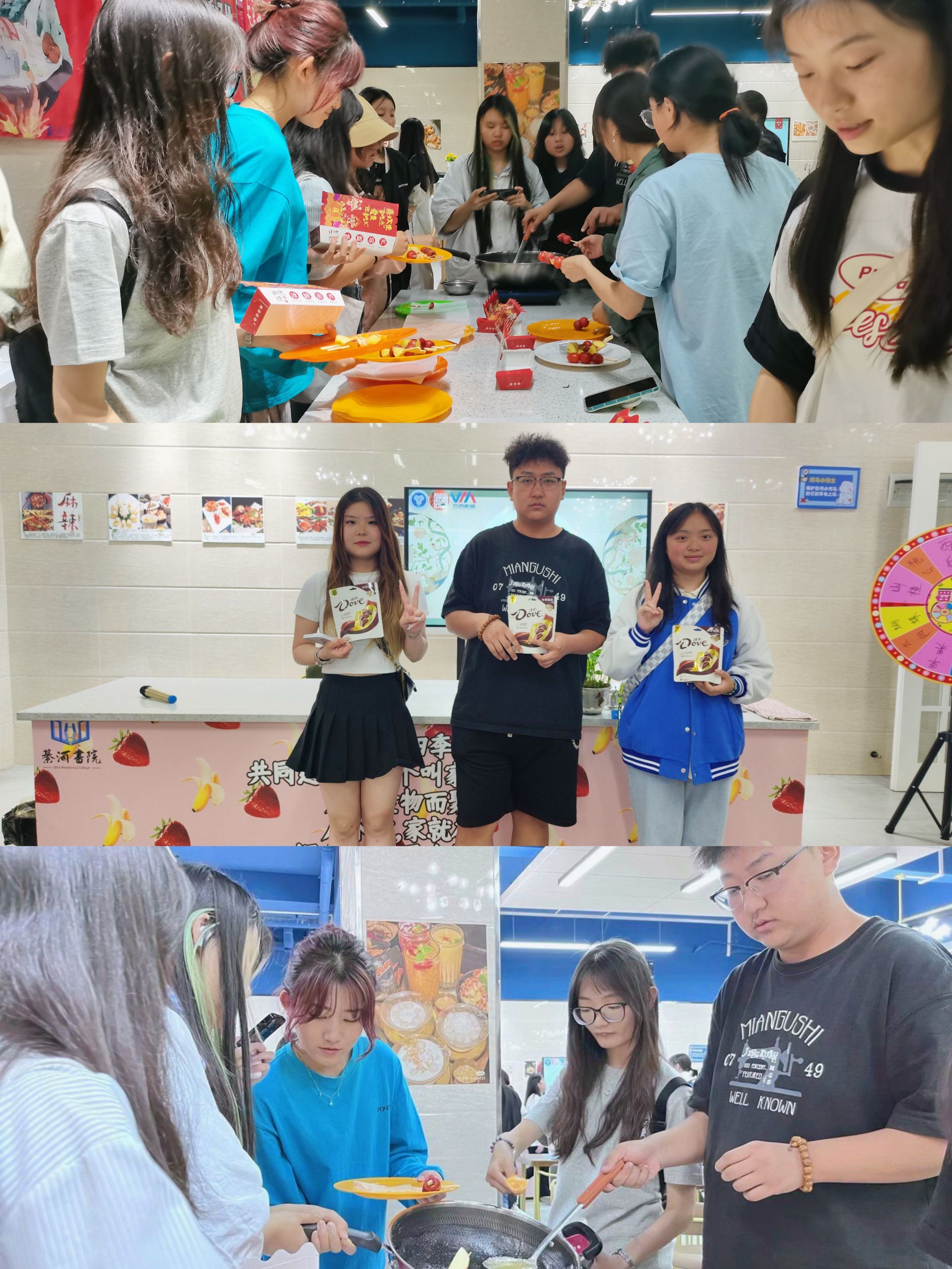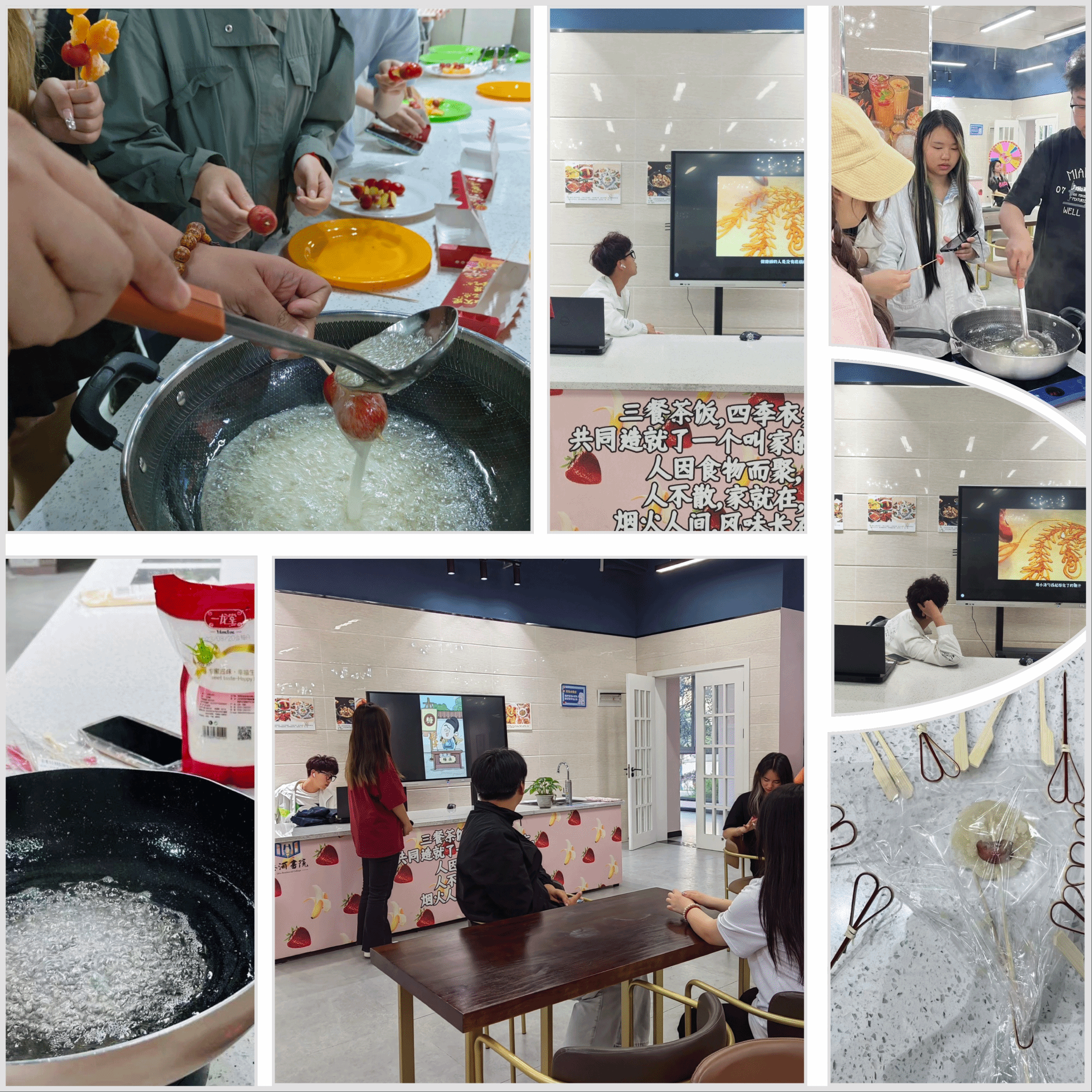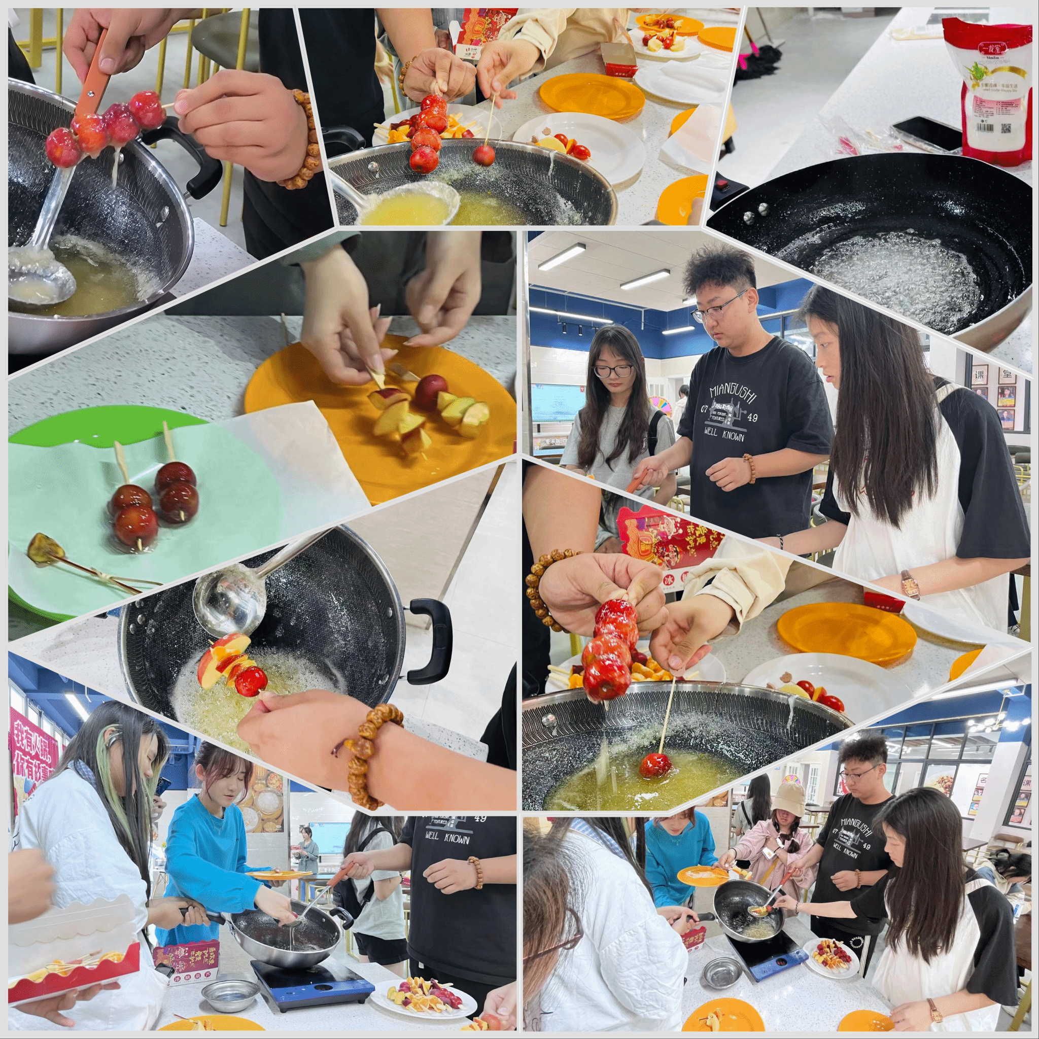 不论是糖画还是糖葫芦,糖都是不可或缺的重要一环,在同学们挑选创作的间隙,工作人员便在一旁为大家熬制糖,同学们跃跃欲试主动前来体验一番熬糖的滋味儿。一根精美的竹签串起一颗颗爽脆的水果在冒着热气的糖浆中一滚糖葫芦便成了,糖的清香扑面而来沁人心脾,各种水果的搭配令人眼前一亮。随着缕缕糖丝的飘洒,一个充满设计感的图案呈现在眼前,再趁热粘上一根竹签,糖画便大功告成,同学们将创意融入糖画设计,在装饰上有着独属于自己的看法。