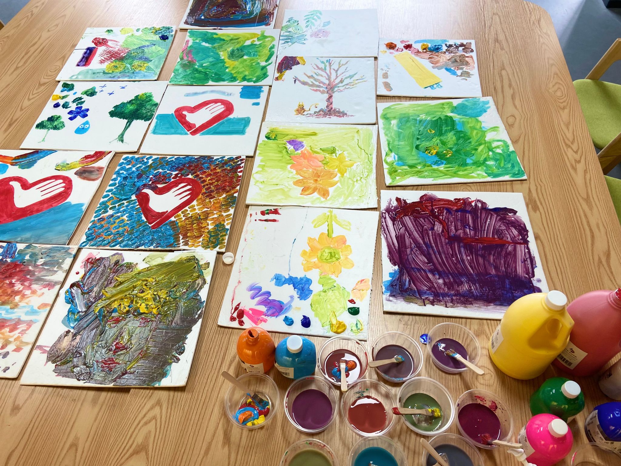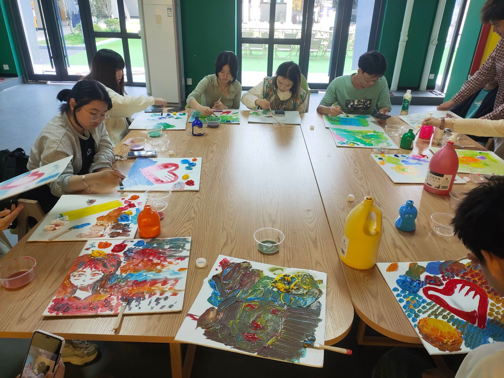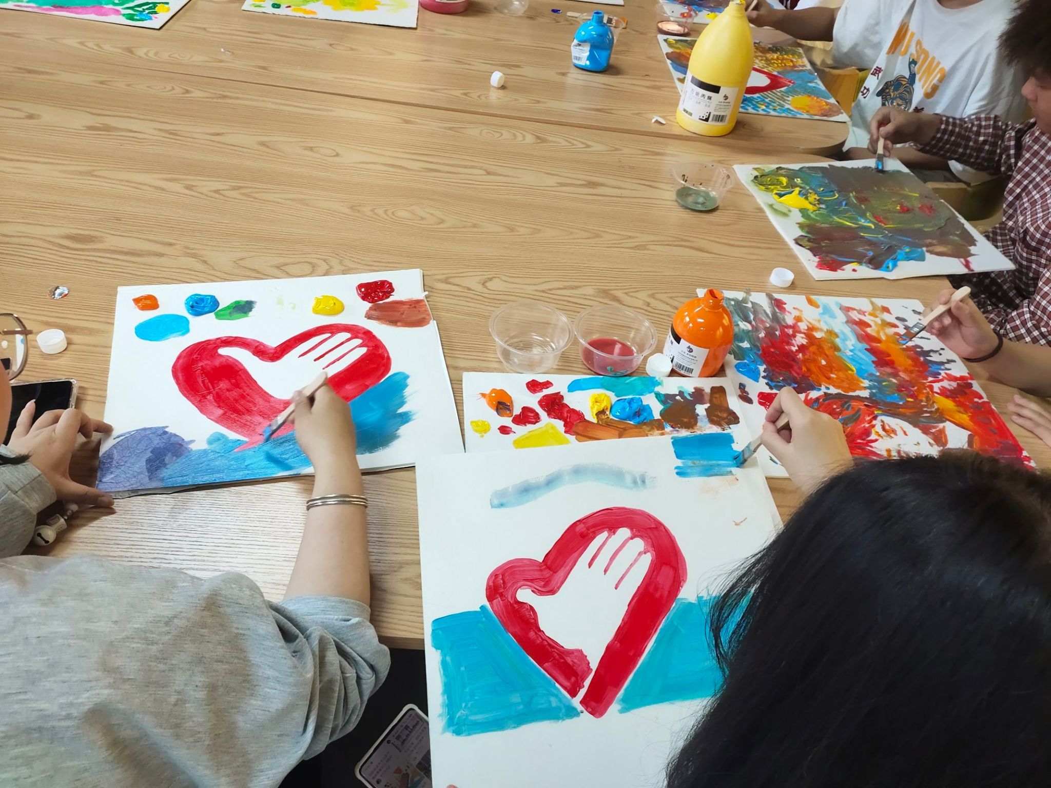 对调色逻辑进行初步学习后,苏同学用丙烯颜料画出象征志愿精神的心手,为大家现场演示如何涂鸦和配色,在他绘声绘色的操作演练下,支队成员都显得有些急不可耐,大家纷纷拿起刷子,打开颜料,进行自由调色,每一步都井然有序,不一会儿,志愿心手、花草树木在同学们的创作下显得格外灵动。