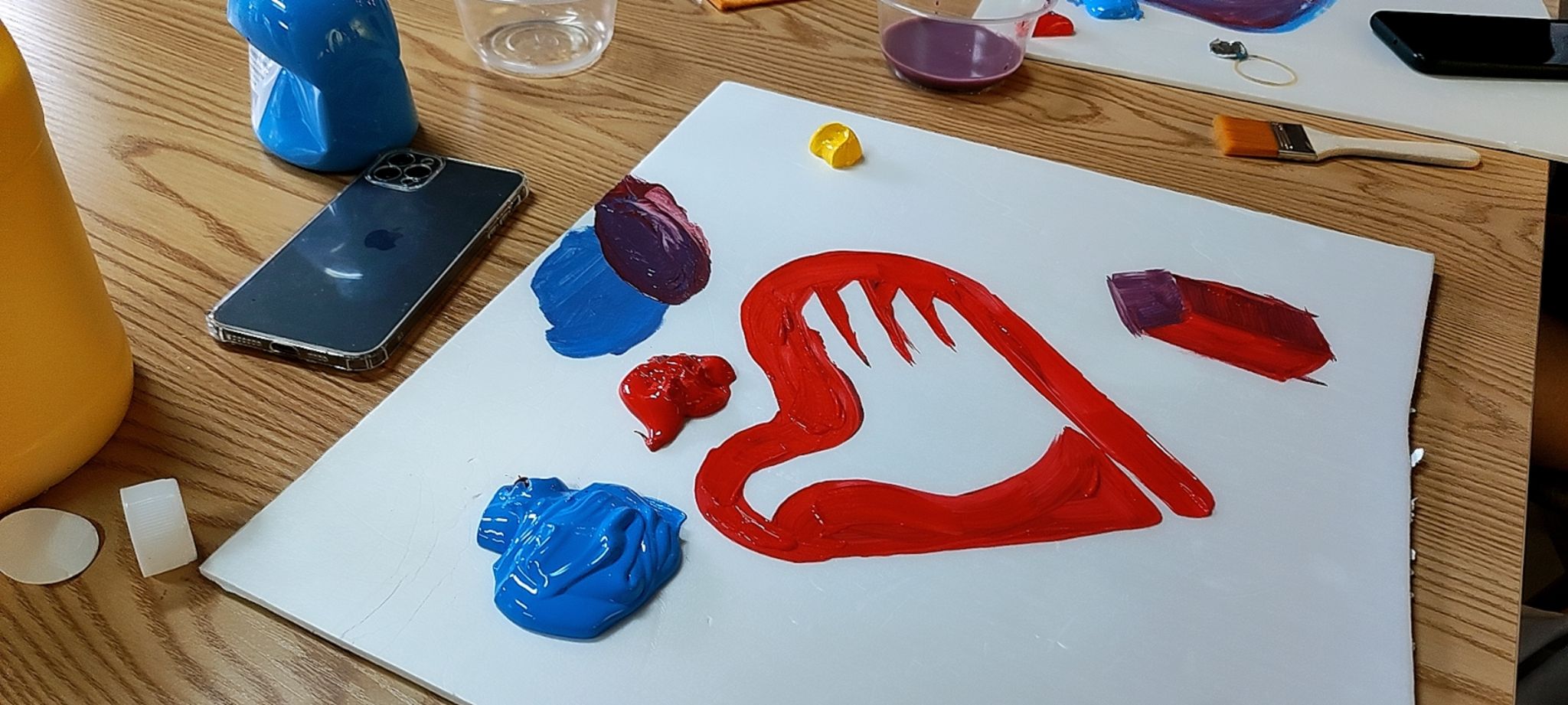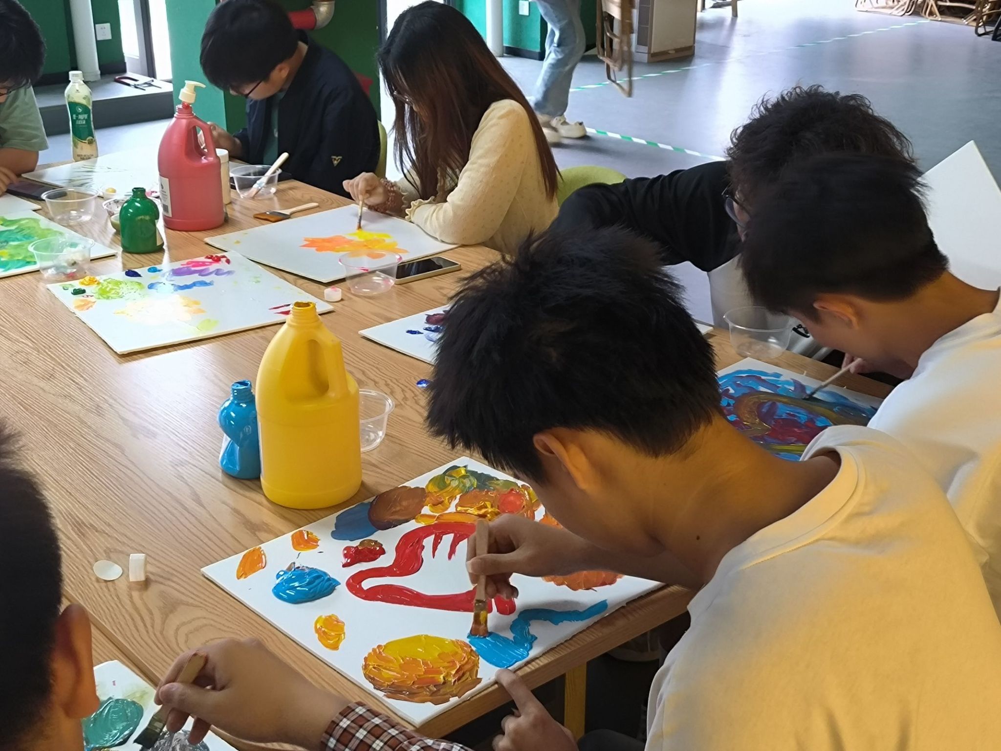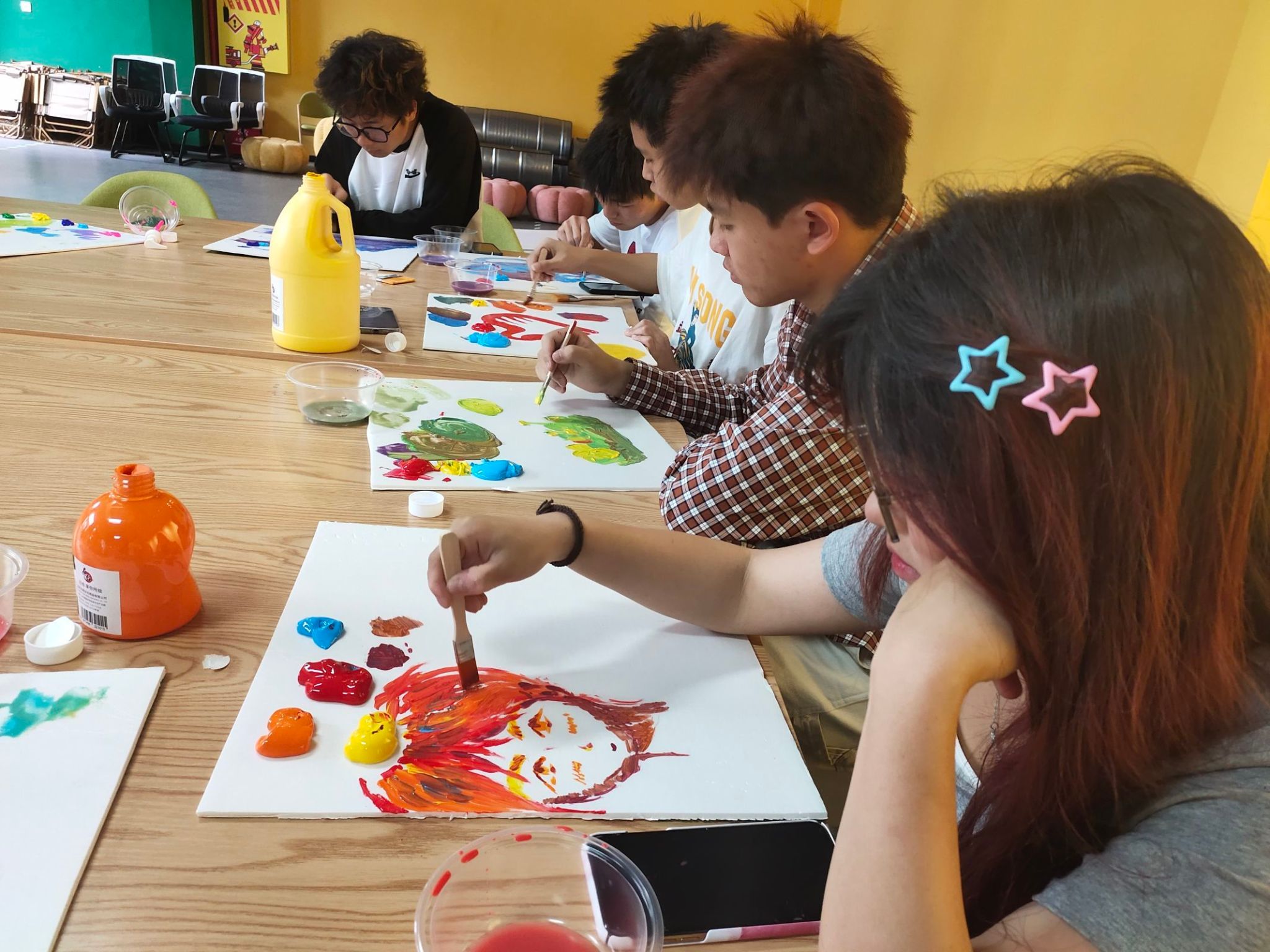 课程伊始,苏同学向同学们介绍了丙烯颜料速干、保持性久、颜色饱满等特点,再以色环为基准,为同学们讲述如何以现有的颜色去调配出新的颜色。例如,加水稀释使颜色变淡,再直接和其它颜色进行混合则可以形成新的颜色,又或者直接用丙烯颜料进行混合。这不仅勾起了支队同学们对颜料调色的兴趣,还给了大家们对缤纷色彩的想象空间。