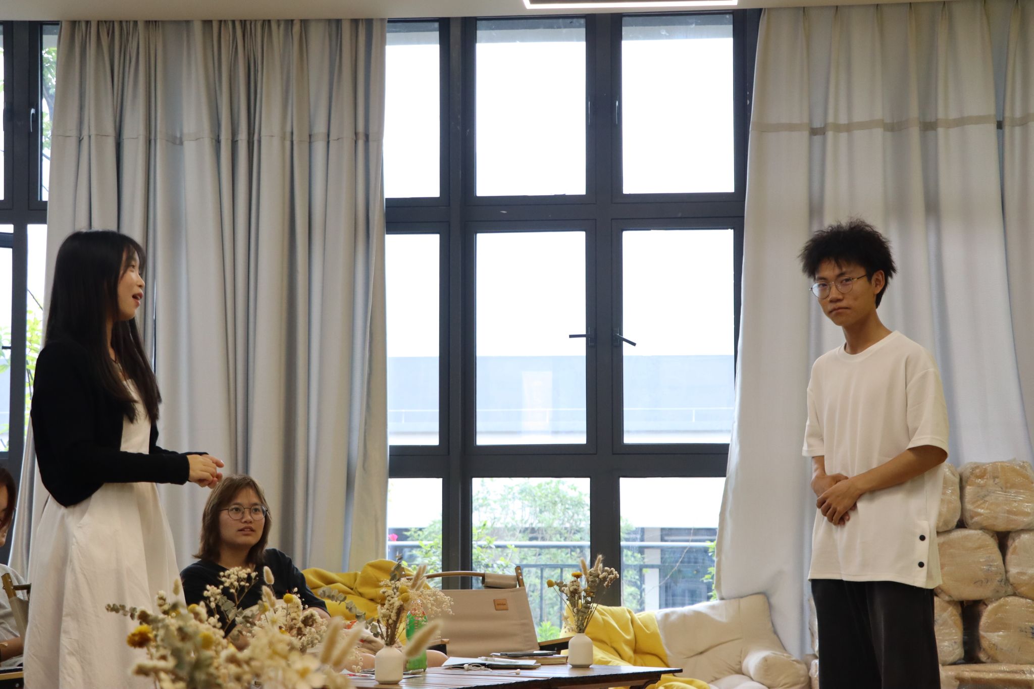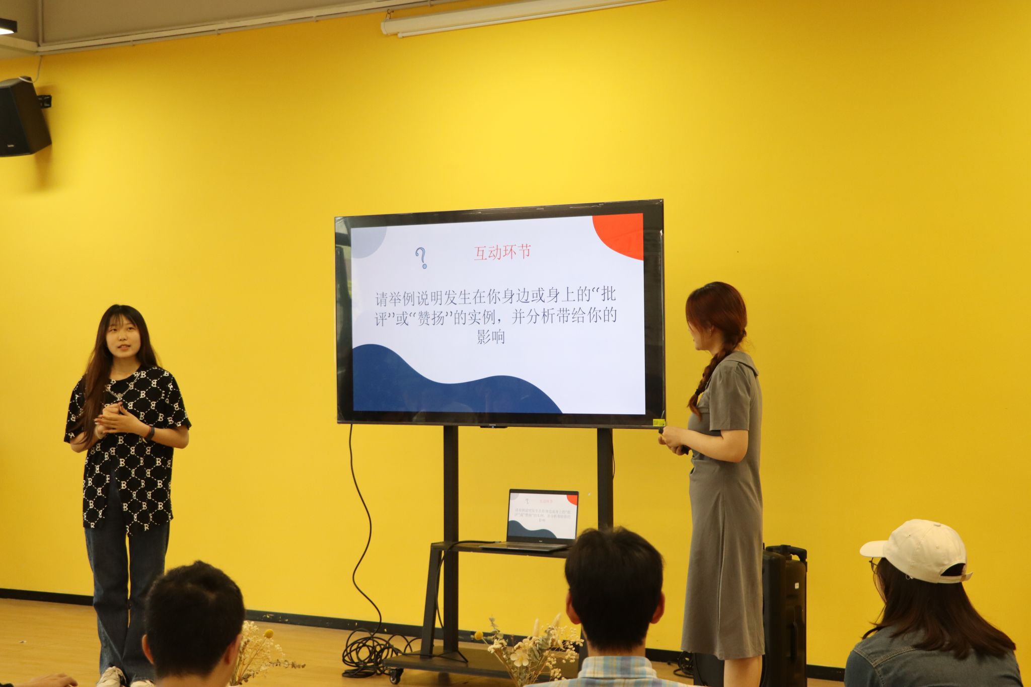 思佳学姐还与同学们进行小互动环节,邀请干事们举例说明发生在我们身边或身上关于“批评”或“赞扬”的实例。来自青协的梁高智同学率先举手,落落大方地讲最近发生在他身上的一件事:他因为前段时间忙于心理剧的排练,导致耽误了青协的答辩准备进度,这一疏忽给其他干事增加了工作量,梁高智同学为此感到十分愧疚,他决心以后对于工作上的冲突做到更合理的安排,不耽误进度、不懈怠责任。青协的另一位干事张悦同学也分享到她代表青协前去答辩的经历,戏影青协作为新成立的团队,干事们都是大一的新生,很多事情还缺乏经验,这次答辩尽管在汇报时有些紧张卡顿,但是也受到了老师的鼓励与表扬,使她增添了许多信心,有动力有决心在未来的工作中继续奋斗前行。其他部门同学也主动分析那个自己的经历和观点。思佳学姐最后也提到“希望大家都能够去做语言的主人,然后精准的去表达去沟通,让自己成为那个很善于表达的人,你不妨大胆一点,你没有那么多观众,就是勇敢地表达自己。”