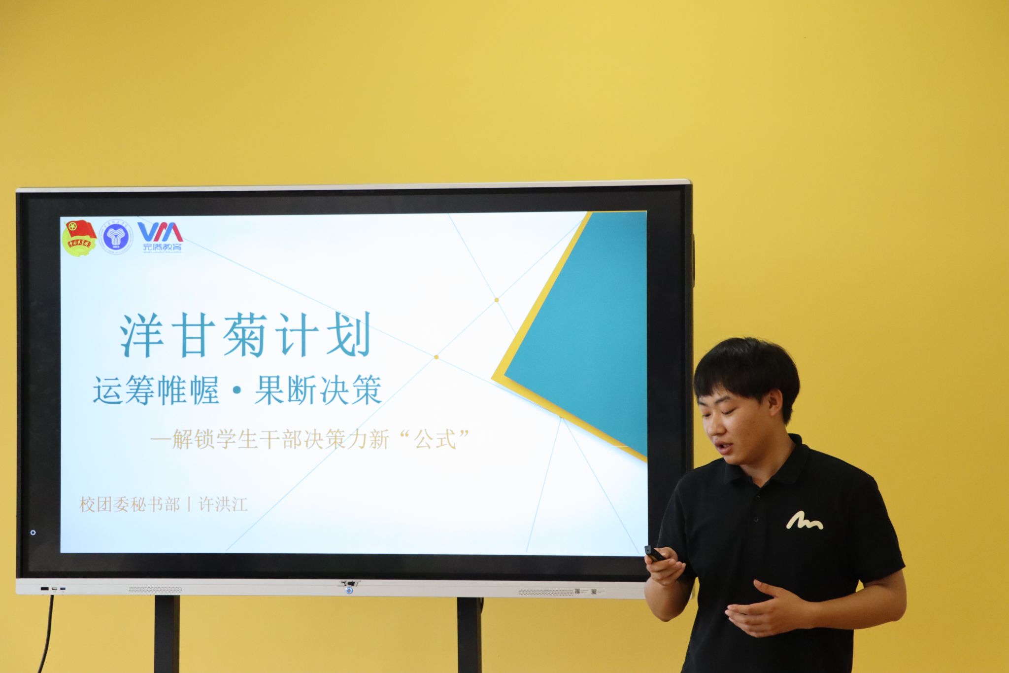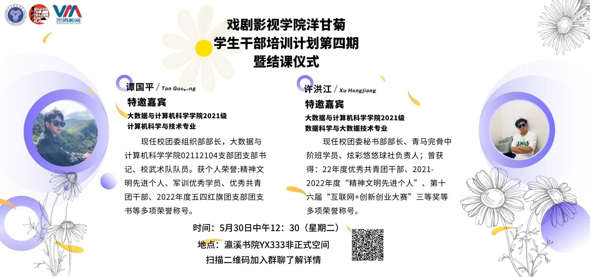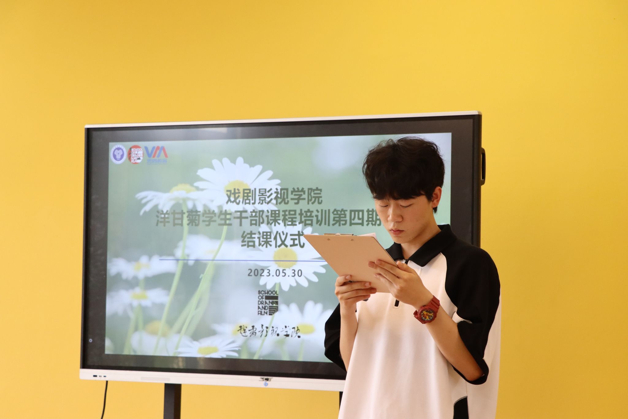 带着满腔的热情,怀着美好的憧憬,为了戏剧影视学院学生组织的健康向上发展,激发学生干事的活力与潜力,助力学院优秀干事快速成长,戏剧影视学院团总支于5月30日12:30在瀛溪书院YX333举行“洋甘菊”学生干部培养计划第四期暨结课仪式,本期课程围绕学生干部决策力培养展开,邀请校团委组织部谭国平学长和秘书部许洪江学长主讲,由动画2班沈奇主持。