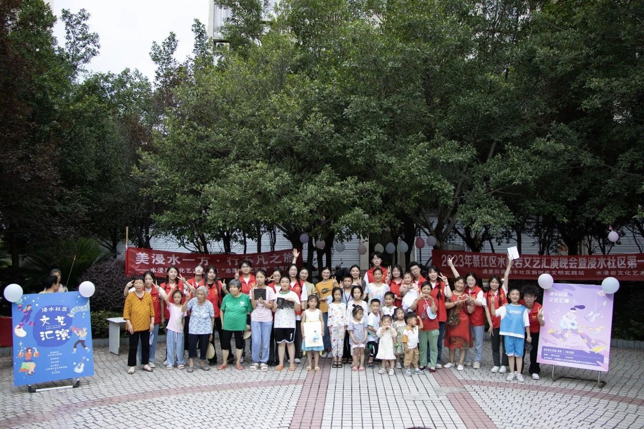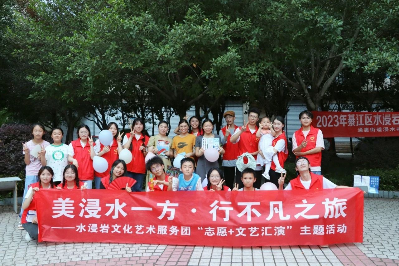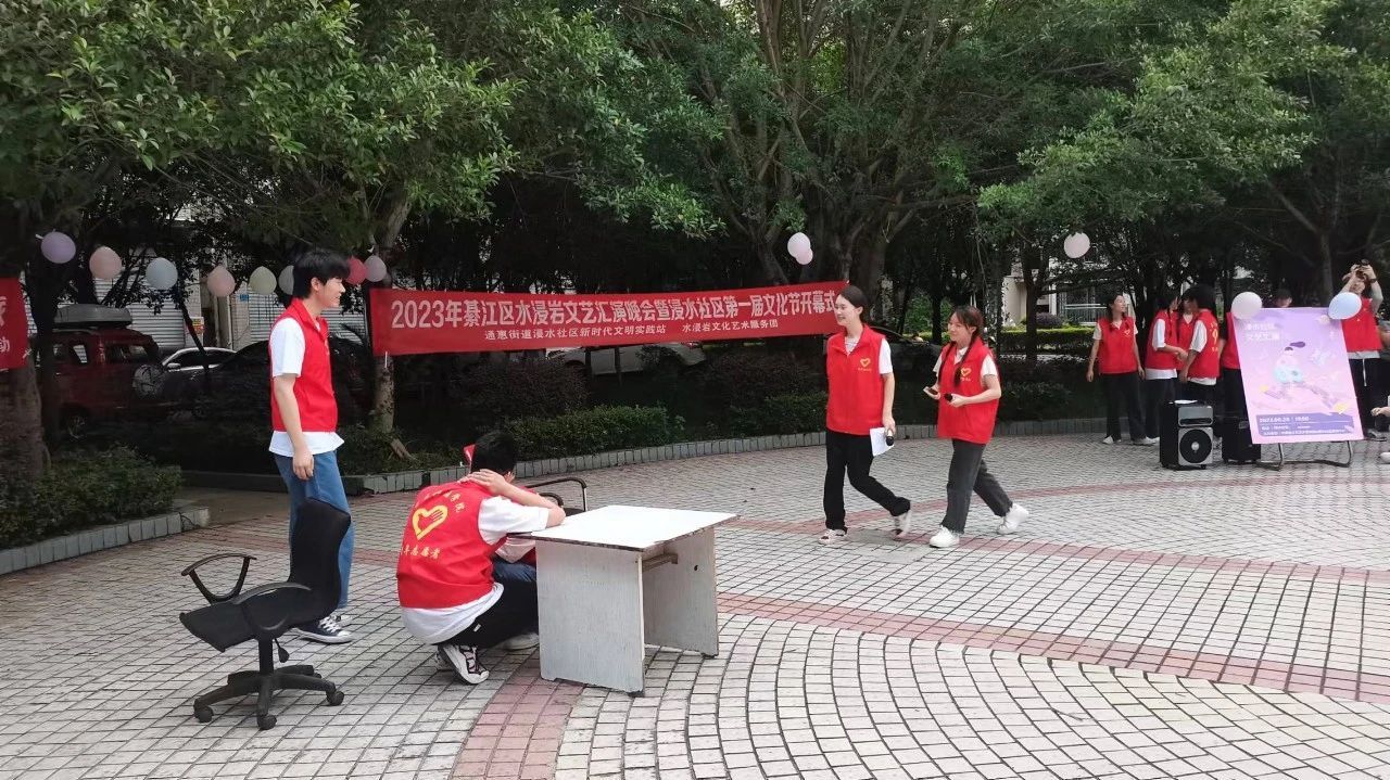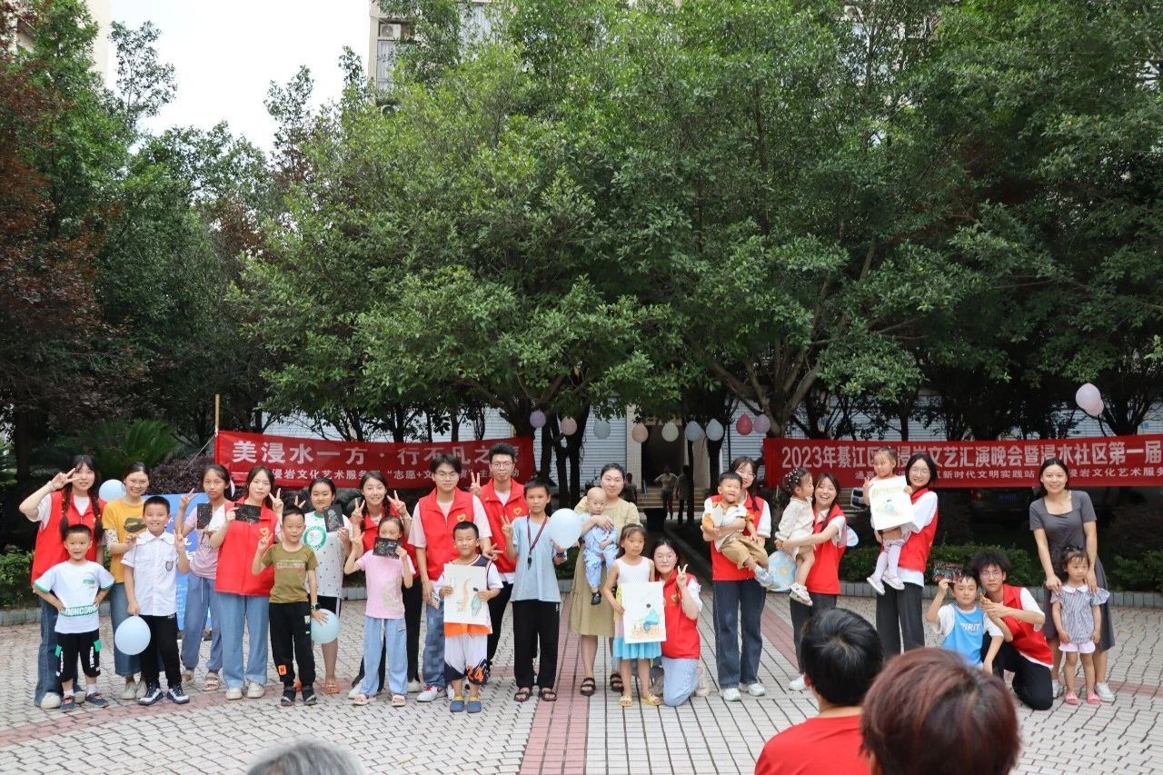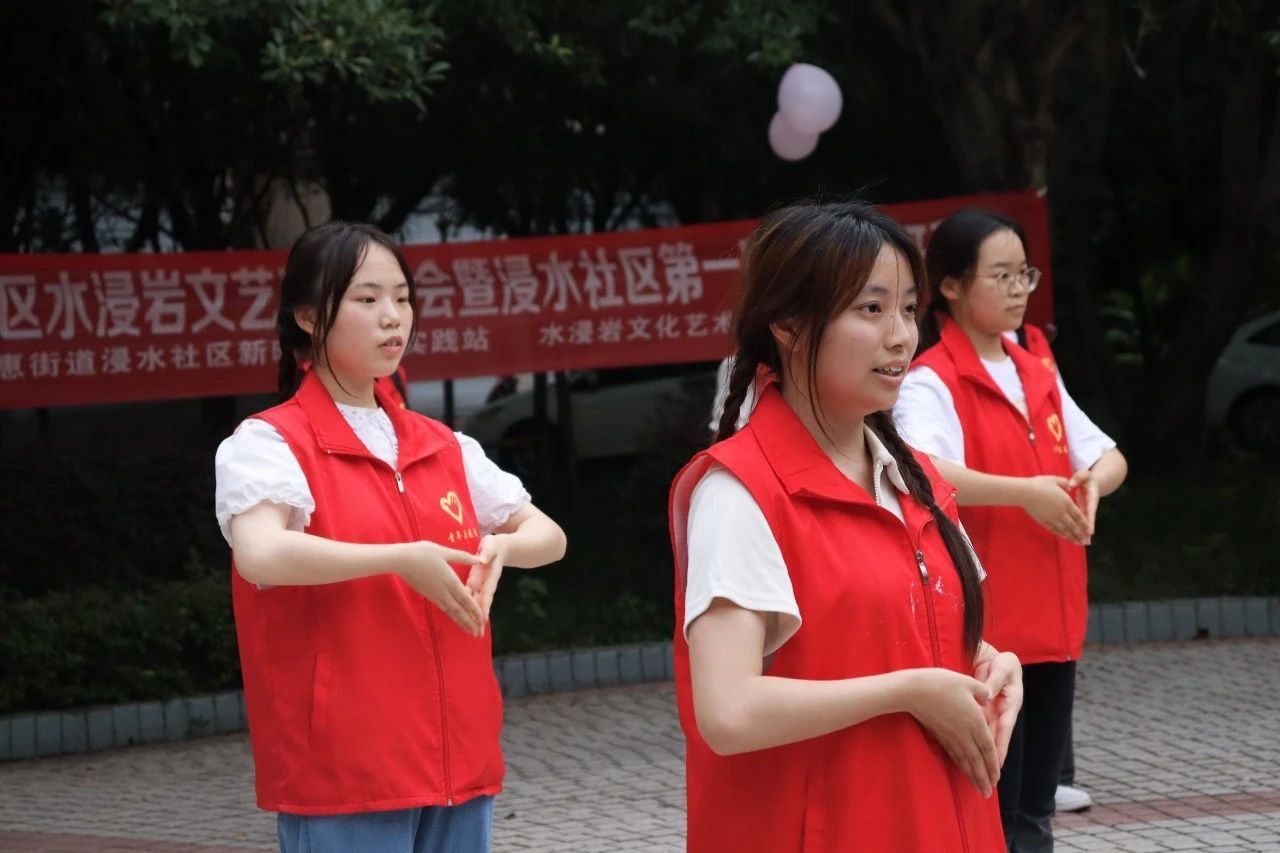 为充分展现新时代青年大学生良好的精神面貌,丰富社区文化生活,7月6日,水浸岩文化艺术服务团与浸水社区便民服务中心共同开展“志愿+文艺汇演”主题活动暨浸水社区第一届社区文化节,服务团成员和社区小朋友们一同参与表演,浸水社区李安连书记、水浸岩文化艺术服务团指导老师曾玉娇、潘锐与居民朋友们一起观看演出。本次文艺汇演,让校园艺术走进社区,为社区居民带来丰富多彩的艺术体验,也为水浸岩文化艺术服务团的“三下乡”之旅画上了圆满的句号。