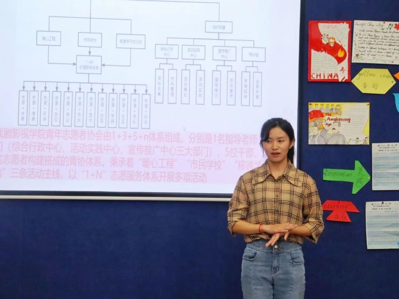 会议第二项,由部长张悦讲解了戏影青协的组织架构。戏剧影视学院青年志愿者协会由1+3+5+n体系组成,分别是1名指导老师,3个部门(综合行政中心、活动实践中心、宣传推广中心三大部门),5位干部,以及多名志愿者构建搭成的青协体系。