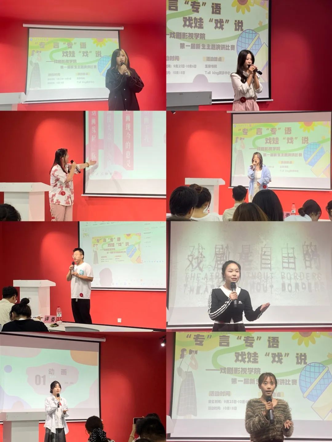 首轮8名选手依次登台演讲拟定的主题,多日的精心准备让戏娃们用自己最自信的状态和激情昂扬的演讲向观众们抒发对自身专业的独到的情感,阐述自己的观点,声情并茂的演讲展现出属于戏娃们独特的自信与活力风采。首轮结束台下掌声不断,各位选手们为大家带来了一场精彩绝伦的演讲比赛