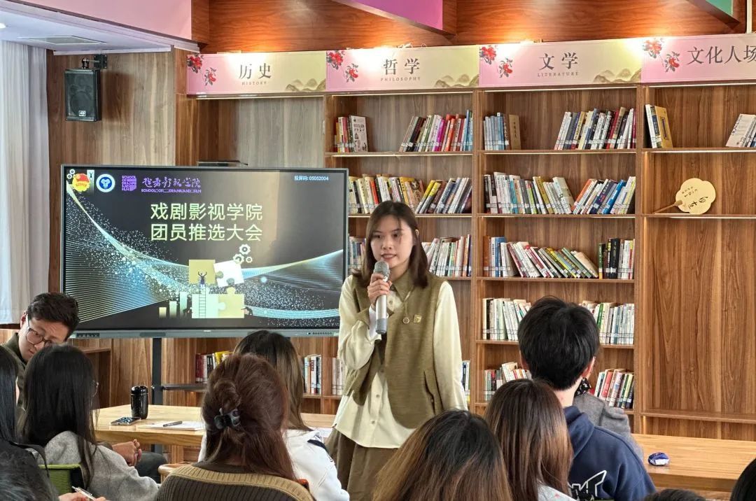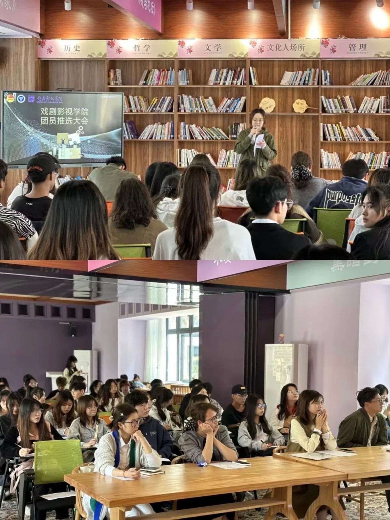 推优工作是基层组织工作中的一项重要的日常性工作,而深入做好“推优”工作,则是党组织赋予共青团的光荣职责,是共青团组织充分发挥党的助手和后备军作用的重要体现,是广大团员青年健康成长的迫切需要。通过推选工作,使广大优秀同学加入共青团,这对于加强和改进党团建设,实施固本强基工程具有十分重要的意义。2023-2024学年戏剧影视学院团员推选大会于11月1日12:30在观云书院芒种·华文书吧展开,出席此次大会的有学工办主任曾玉娇、艺术修养与实践板块指导老师王颖、志愿服务指导老师李梦雪、社团活动板块指导老师廖炳屹、各位年级长和各班团支书,以及26位入团申请人。