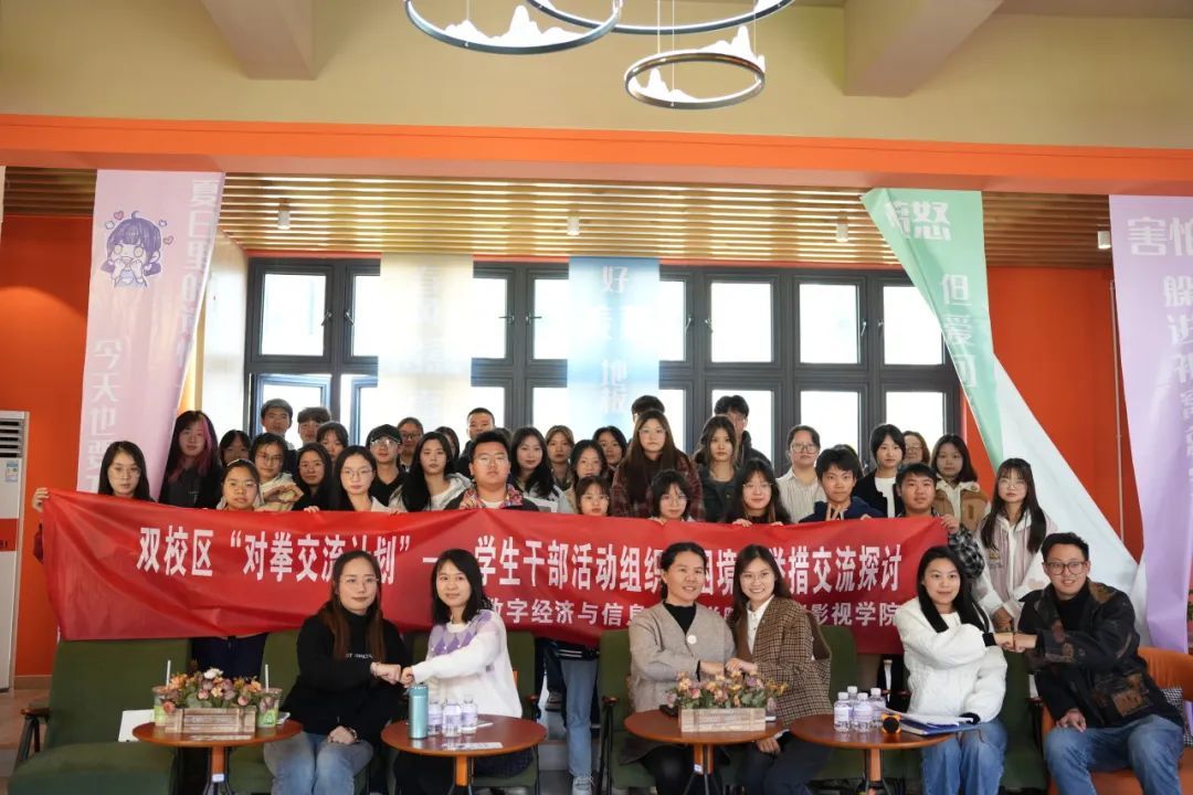 为增进双校区学院间学生组织沟通交流,加强学生干部对外联动,了解学习优秀做法,交流学生活动组织的难题与困境,总结积累活动经验,11月28日中午12:30,戏剧影视学院与数字经济与信息管理学院双校区学生干部相约古剑书院·白虹半间闲室,开展了以“学生干部活动组织的困境与举措”为主题的双校区两学院学生组织“对拳计划”交流分享会,数字经济与信息管理学院学工副院长任瑞娟、合川校区学院团总支书记马莉、綦江校区学院团总支书记潘锐,戏剧影视学院学工办主任曾玉娇、社团活动板块老师廖炳屹,以及30余名干部干事齐聚白虹半间闲室共聊困境,共商举措!