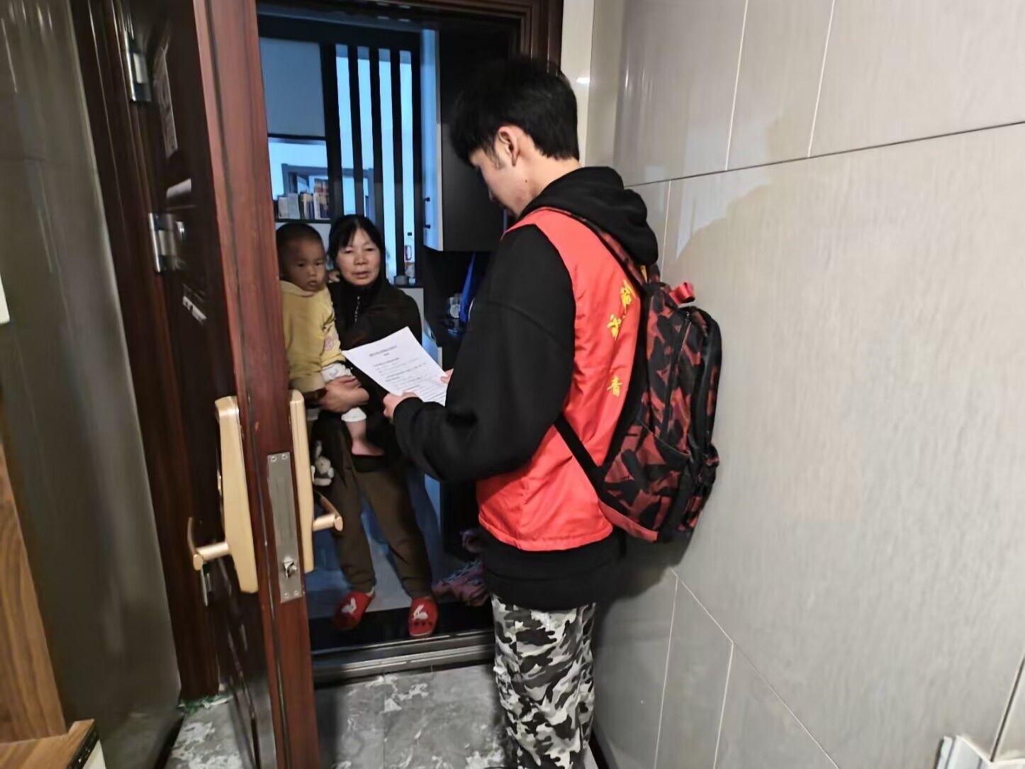 活动开始,组织者带领着动画6班全体人员在校门口集合前往阳光城,于中午14:30与社区负责人进行对接拿到问卷调查,将23人进行一定的分组,分开调查每栋人员对创建文明城区的应答应知。