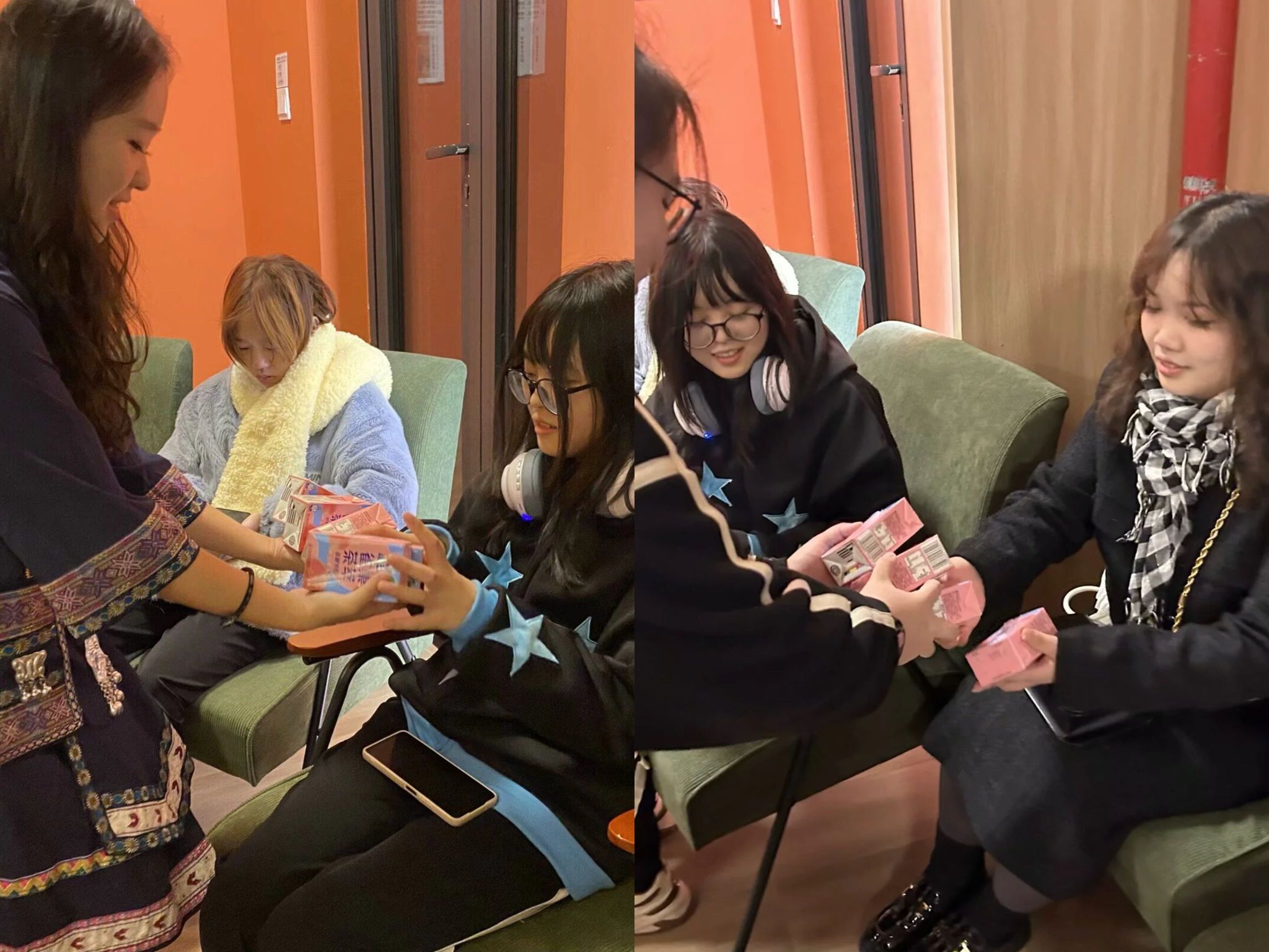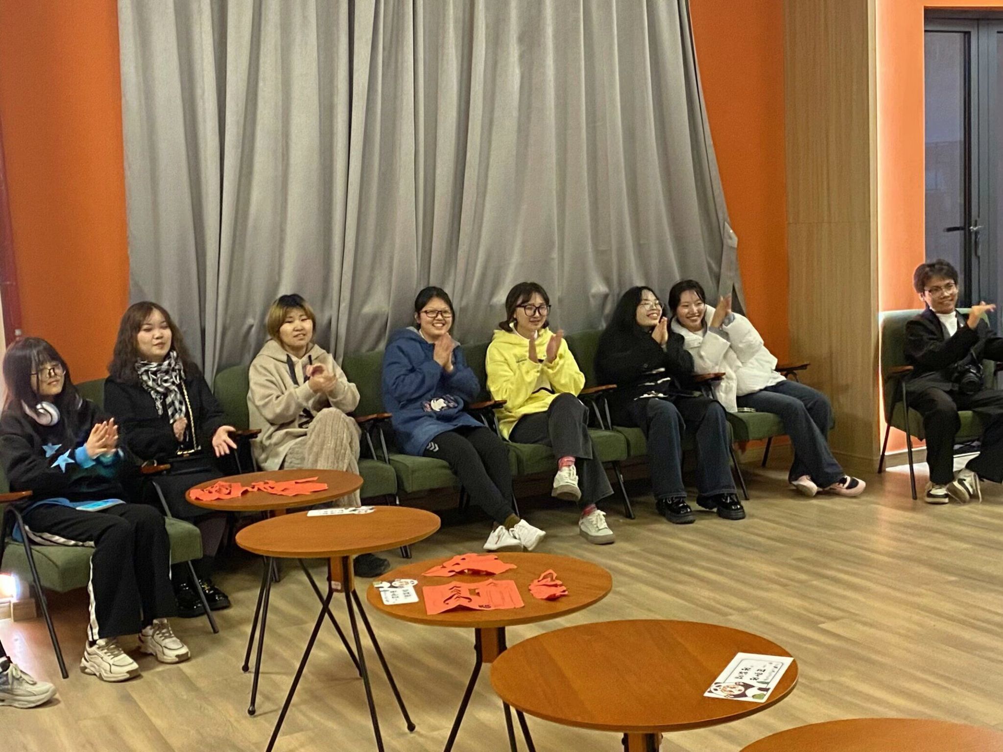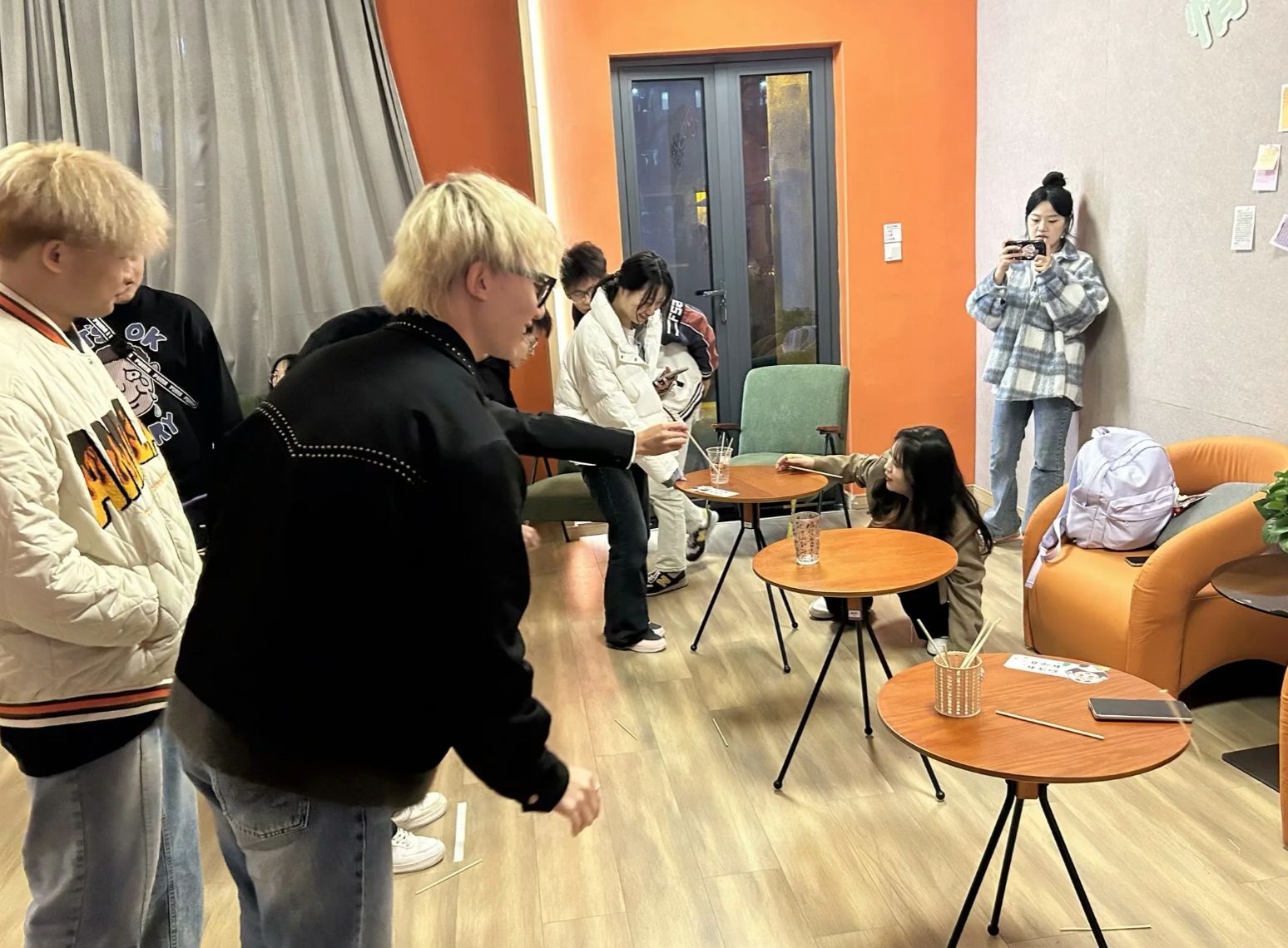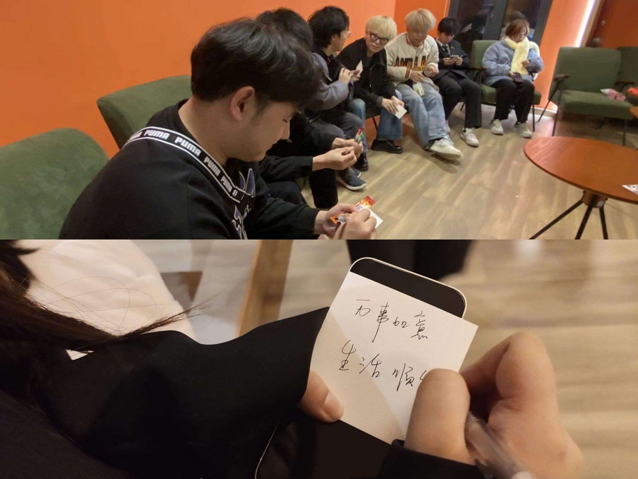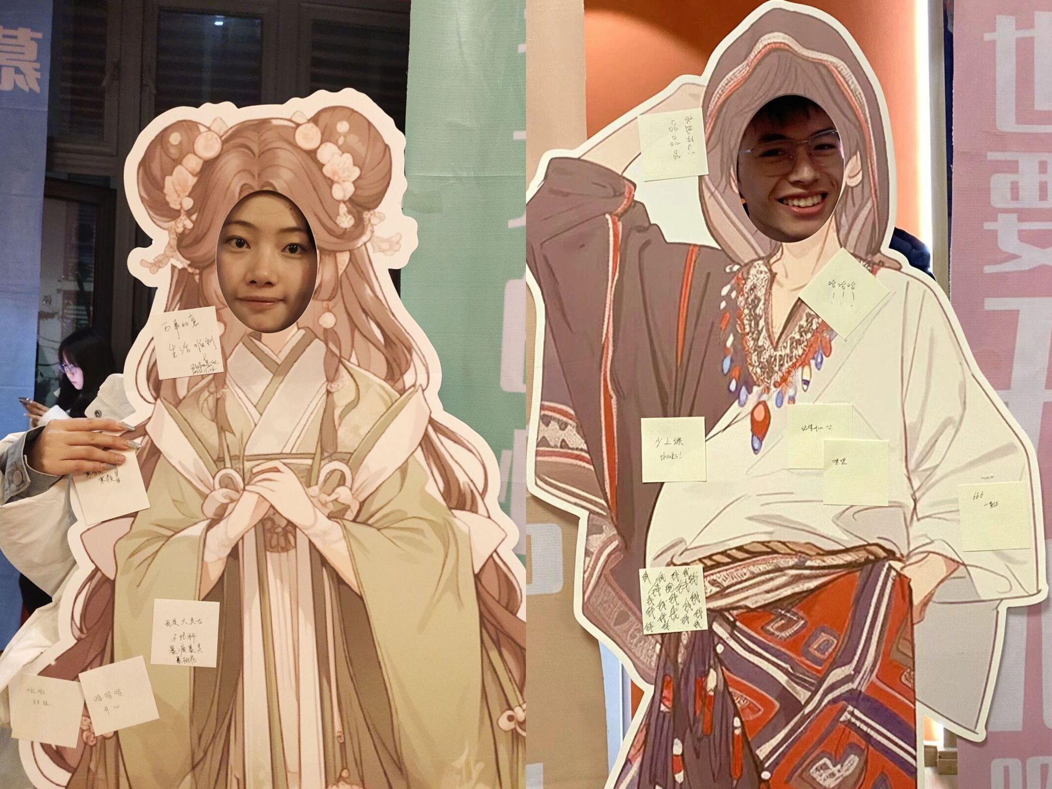 与此同时,活动现场还准备了多种古风KT板,将现场布置得精美有趣,同学们在趣味游戏后也纷纷拍照打卡,在便签上写下青春寄语并贴于KT板上,大大提升了同学们的活动体验感。伴随着欢乐 氛围,活动即将接近尾声,令人激动的获胜方也即将公布,现场工作人员仔细结算两队的成绩。最终,女生组以五分零三秒的优异成绩获胜!工作人员依次颁发奖品,并为获奖的同学们送上祝贺!