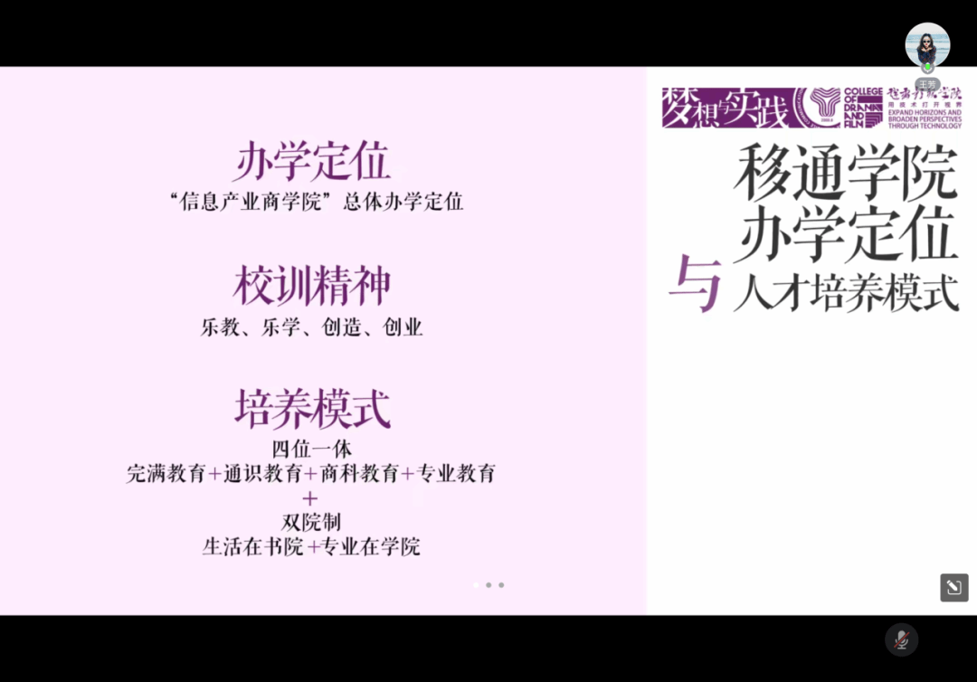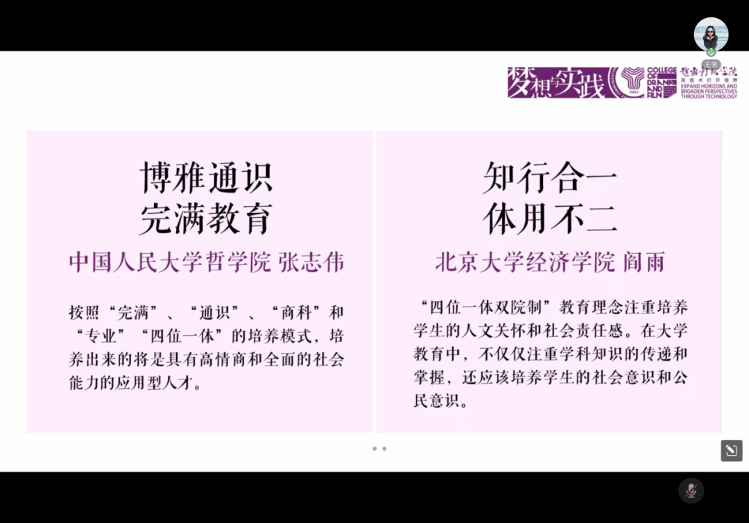 本次会议中,戏剧影视学院组织全体教职工就《名家、名师评< 梦想与实践>》书评进行了深入的学习和讨论,深刻学习领会了《梦想与实践》一书中彭鸿斌董事长一系列重要的教育观点与教育理念。王芳院长领学了《名家、名师评< 梦想与实践>》文件中的核心内容,结合戏剧影视学院办学专业特色、学生发展特色,细致讲解了“四位一体双院制”人才培养模式,深刻解读了我校“信息产业商学院”的办学定位。王芳院长指出,教师作为完满教育理念的践行者,需因材施教、打破俗规,关注培养学生的社会能力、情商沟通能力、组织能力和表达能力,培育出数字经济时代的高情商经营管理人才。
