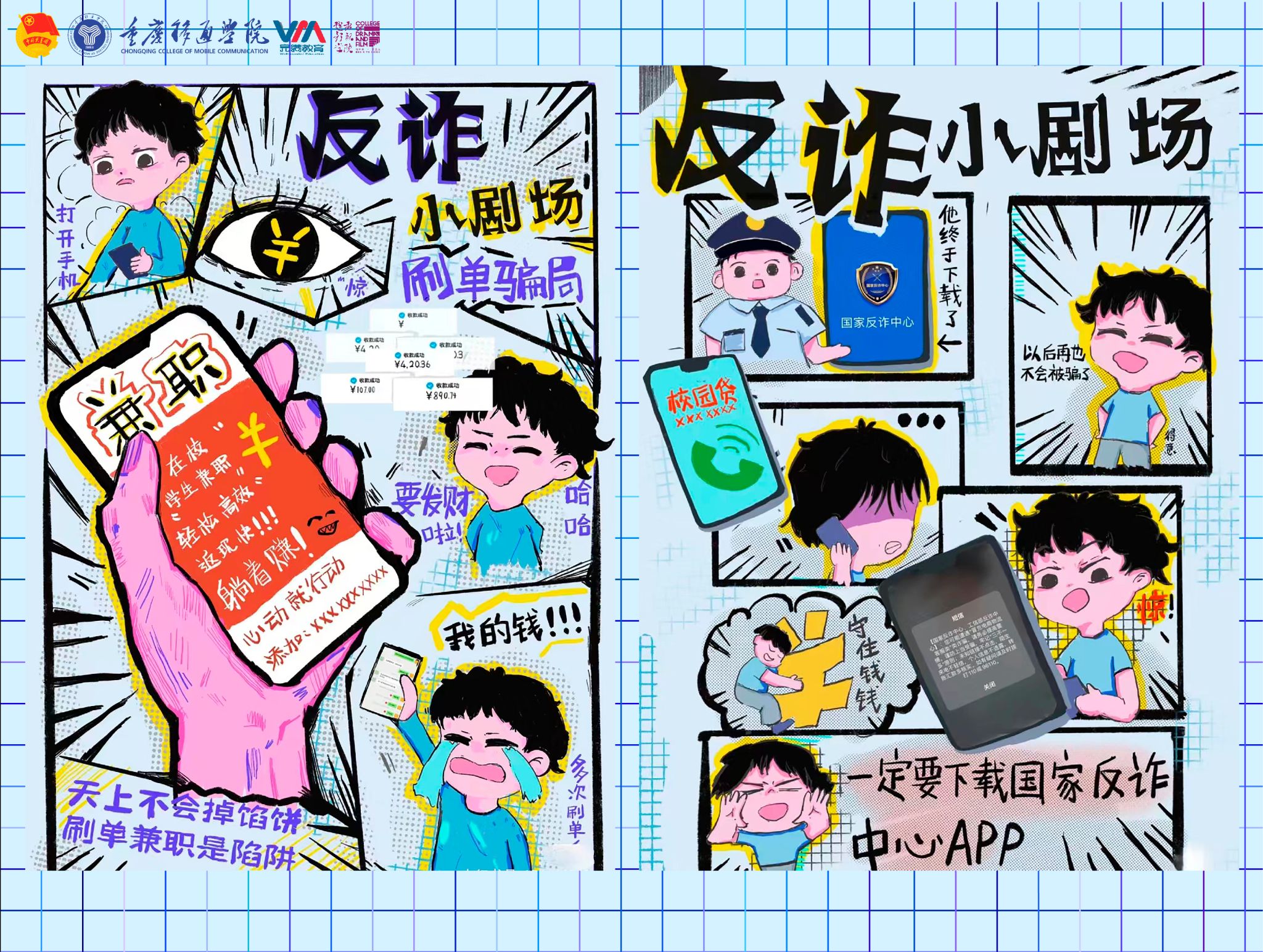 跟随活动地标的指引,同学们去向下一个打卡点,道路两旁的反诈漫画吸引了注意力。这些反诈漫画都是近期发生在大学的真实事件,工作人员用漫画的形式展示出来,时刻提醒同学们注意反诈,不要被所谓的美好诱惑,从而掉进诈骗的陷阱。