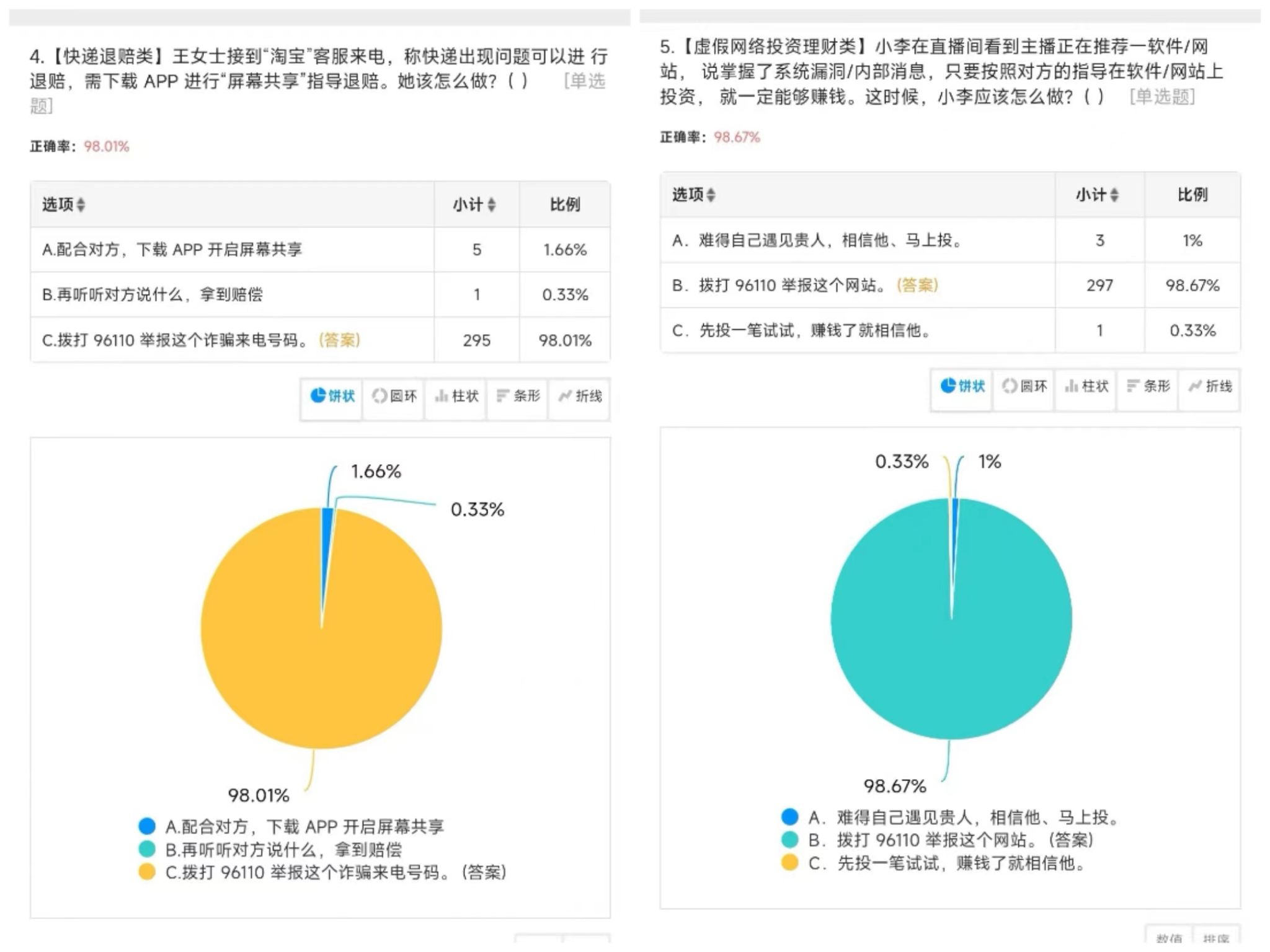 此次反诈咖啡体验日活动共计收到有效问卷301份,通过对问卷分析发现,绝大多数在校大学生对于诈骗信息都有较强的识别能力,对于分辨网络诈骗、“杀猪盘”、网络兼职、网购退款等诈骗信息都有较高的防诈意识。