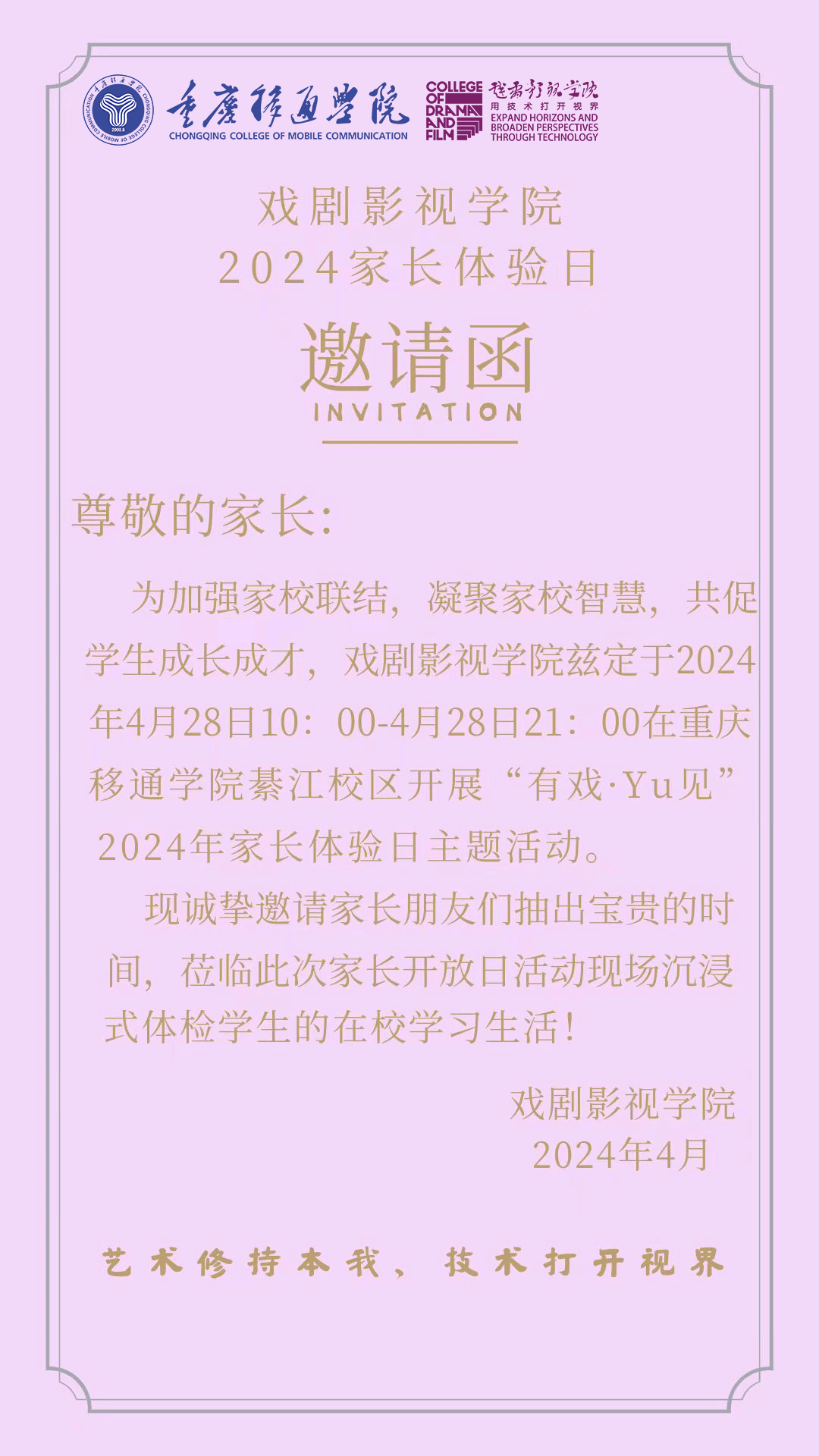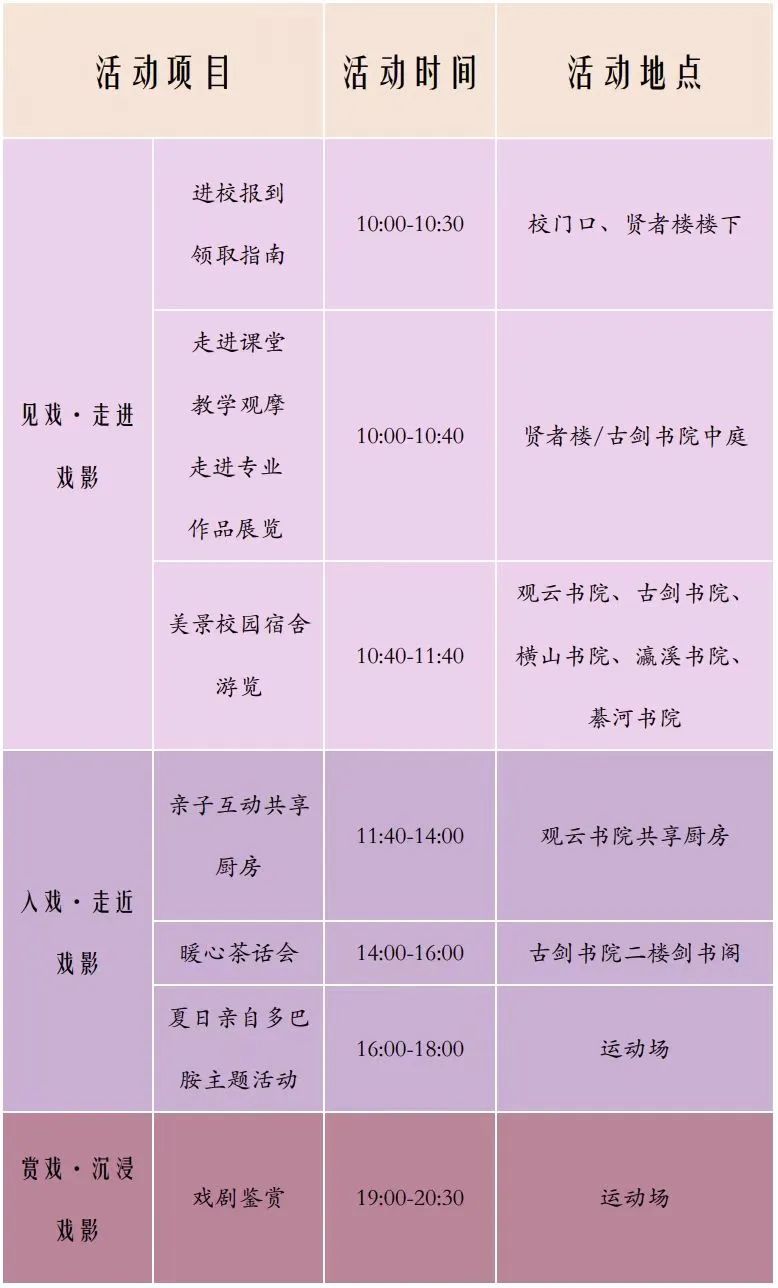 为增强学校、家长、教师之间的交流沟通,让家长走进校园,走进课堂,体验感受学校和学院的特色教育,走进孩子在校学习、生活、工作场域,走近孩子的内心世界,关切孩子的想法和需求,凝聚学校、家庭之间的管理智慧,共同促进孩子健康成长,同时展示学校的办学理念、办学情况和人才培养模式,2024年4月28日,在学校戏剧之夜到来之际,戏剧影视学院拟开展“有戏·Yu见”2024年家长体验日主题活动。