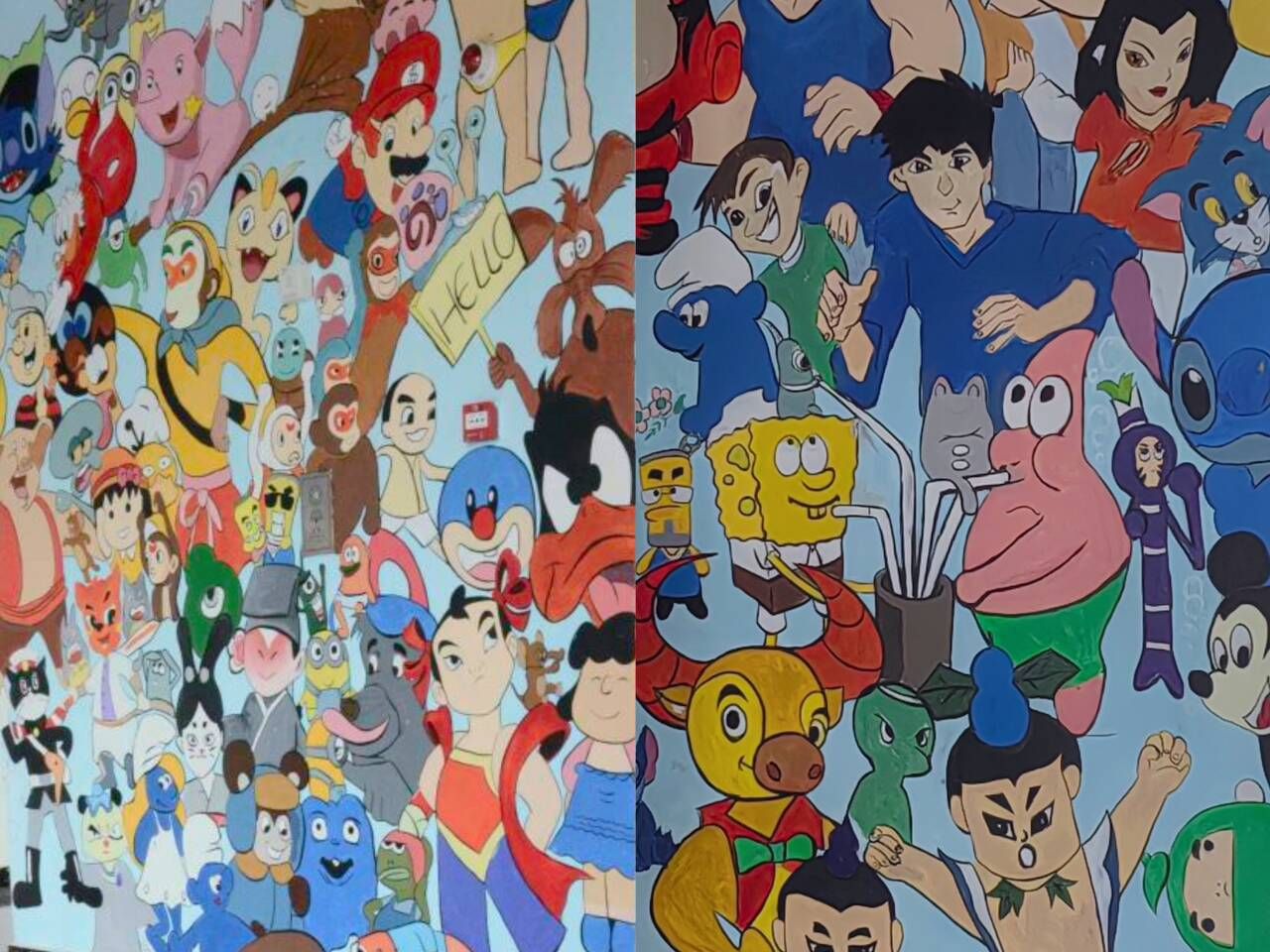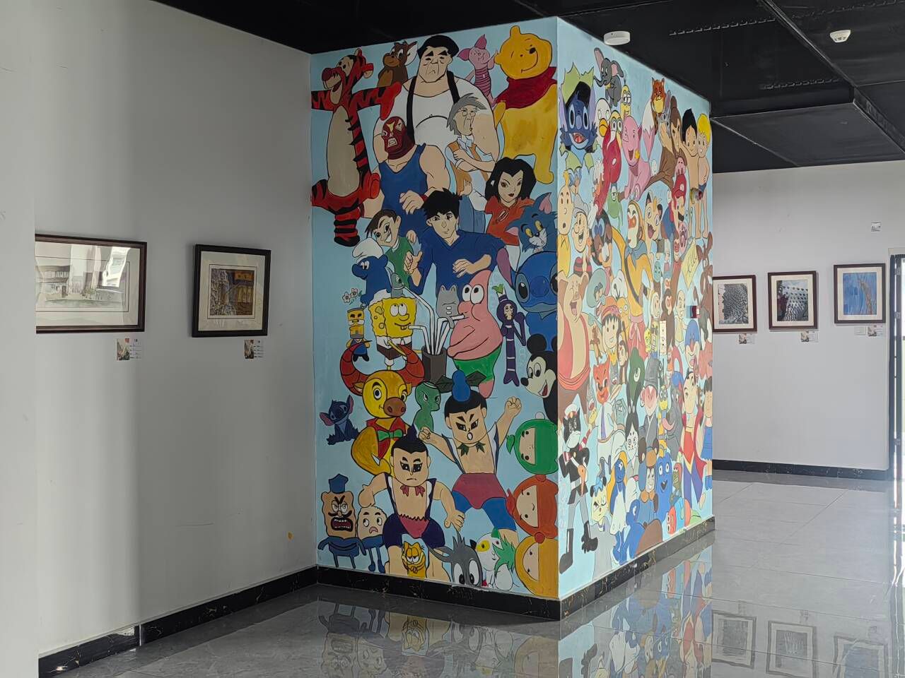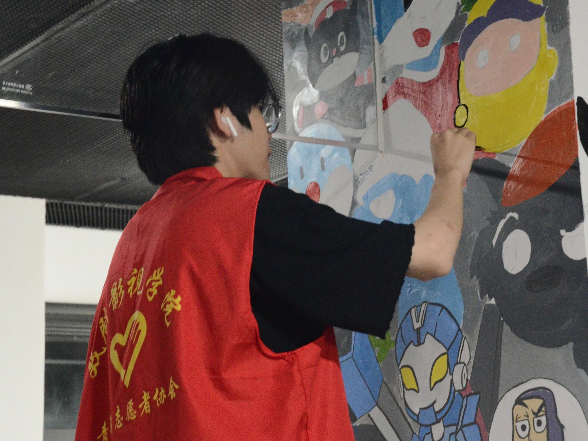本次活动通过线上招募,线下评选,最终选取了22名动画专业的志愿者参与到此次志愿涂鸦活动。准备阶段,墙绘的设计选取了大家耳熟能详的动画角色,在专业老师的指导下,22名志愿者分组进行,根据设计稿大家分工明确,紧密协作,为打造具有戏影特色的文化墙做好充分准备。随着起稿工作展开,困难也接踵而至,由于部分墙体面积较大和高度较高,导致起稿线条难以完美呈现,这给志愿者们带来了不小的挑战。但是办法总比困难多,志愿者们在老师的帮助下和指导下逐一克服难题,相互配合助力,经过一段时间的打磨,所有的墙绘也初具雏形。