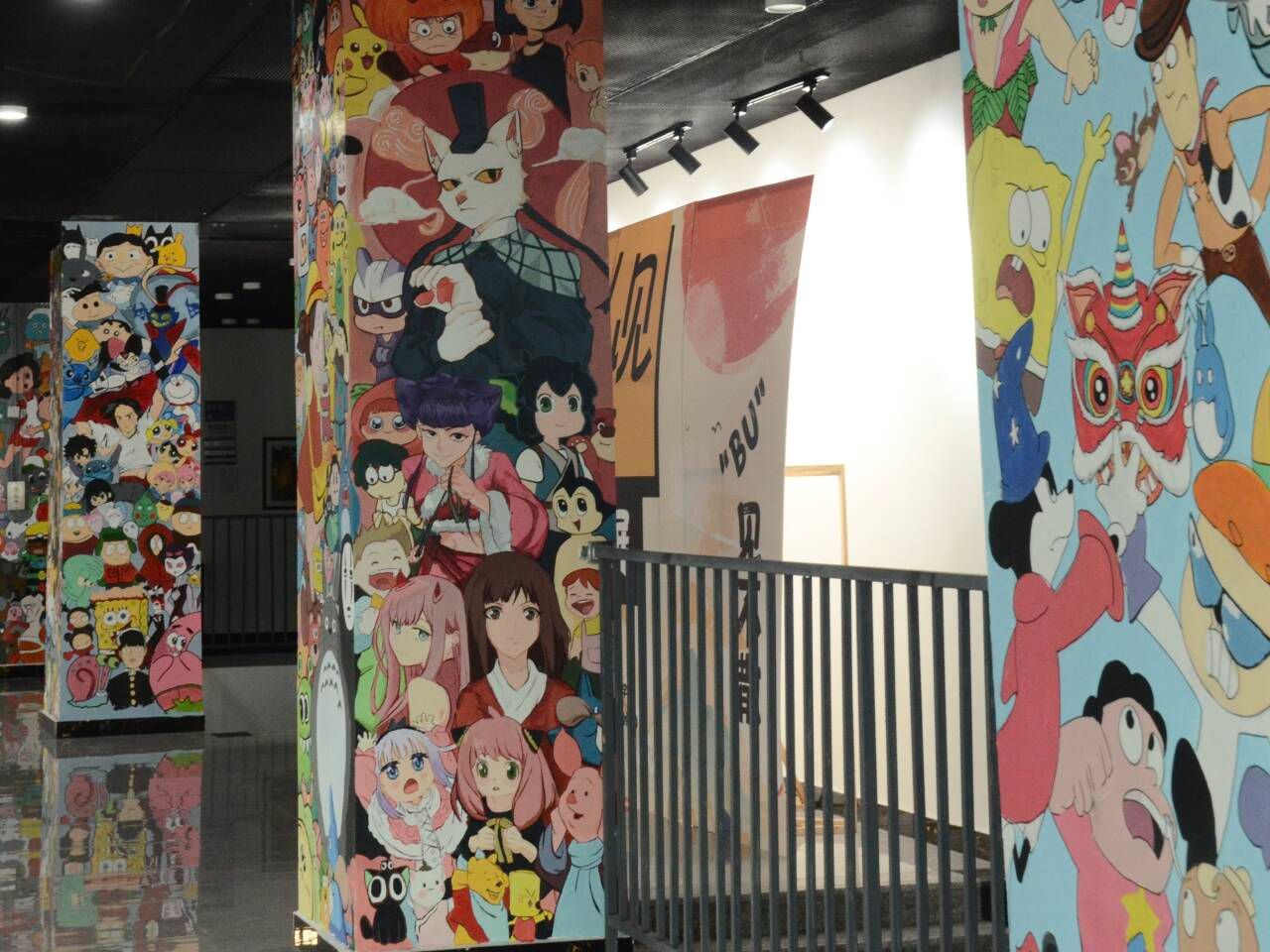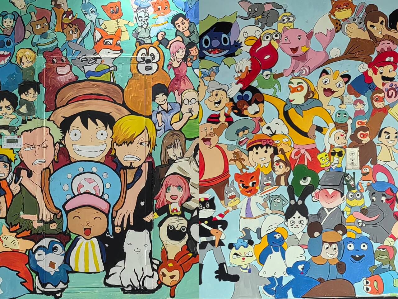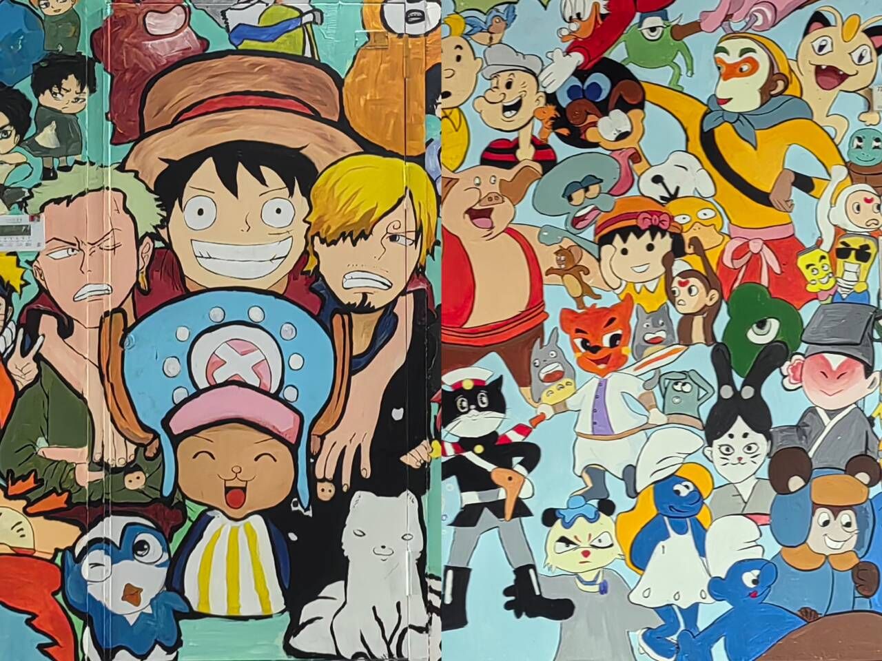 本次活动通过线上招募,线下评选,最终选取了22名动画专业的志愿者参与到此次志愿涂鸦活动。准备阶段,墙绘的设计选取了大家耳熟能详的动画角色,在专业老师的指导下,22名志愿者分组进行,根据设计稿大家分工明确,紧密协作,为打造具有戏影特色的文化墙做好充分准备。随着起稿工作展开,困难也接踵而至,由于部分墙体面积较大和高度较高,导致起稿线条难以完美呈现,这给志愿者们带来了不小的挑战。但是办法总比困难多,志愿者们在老师的帮助下和指导下逐一克服难题,相互配合助力,经过一段时间的打磨,所有的墙绘也初具雏形。