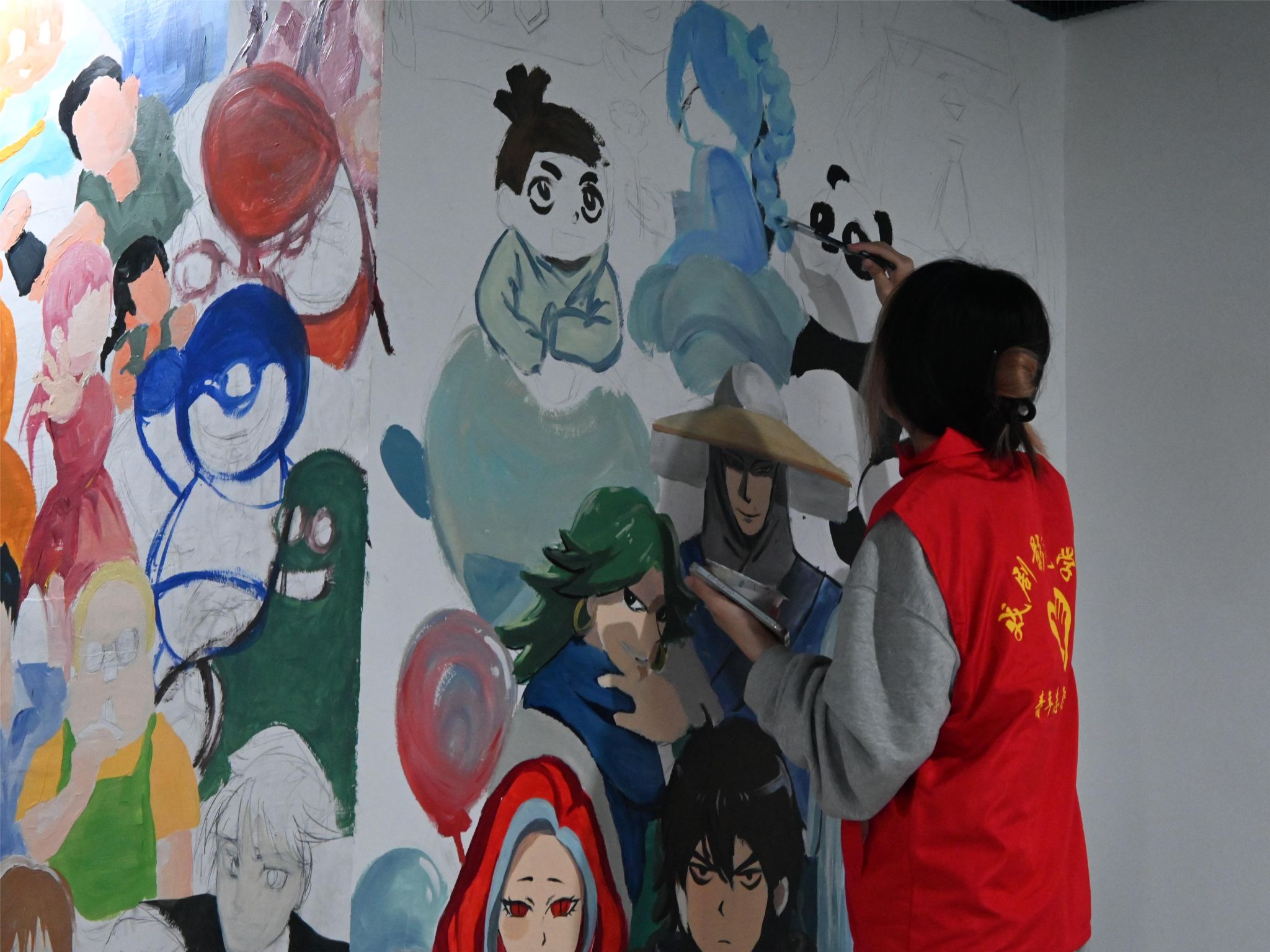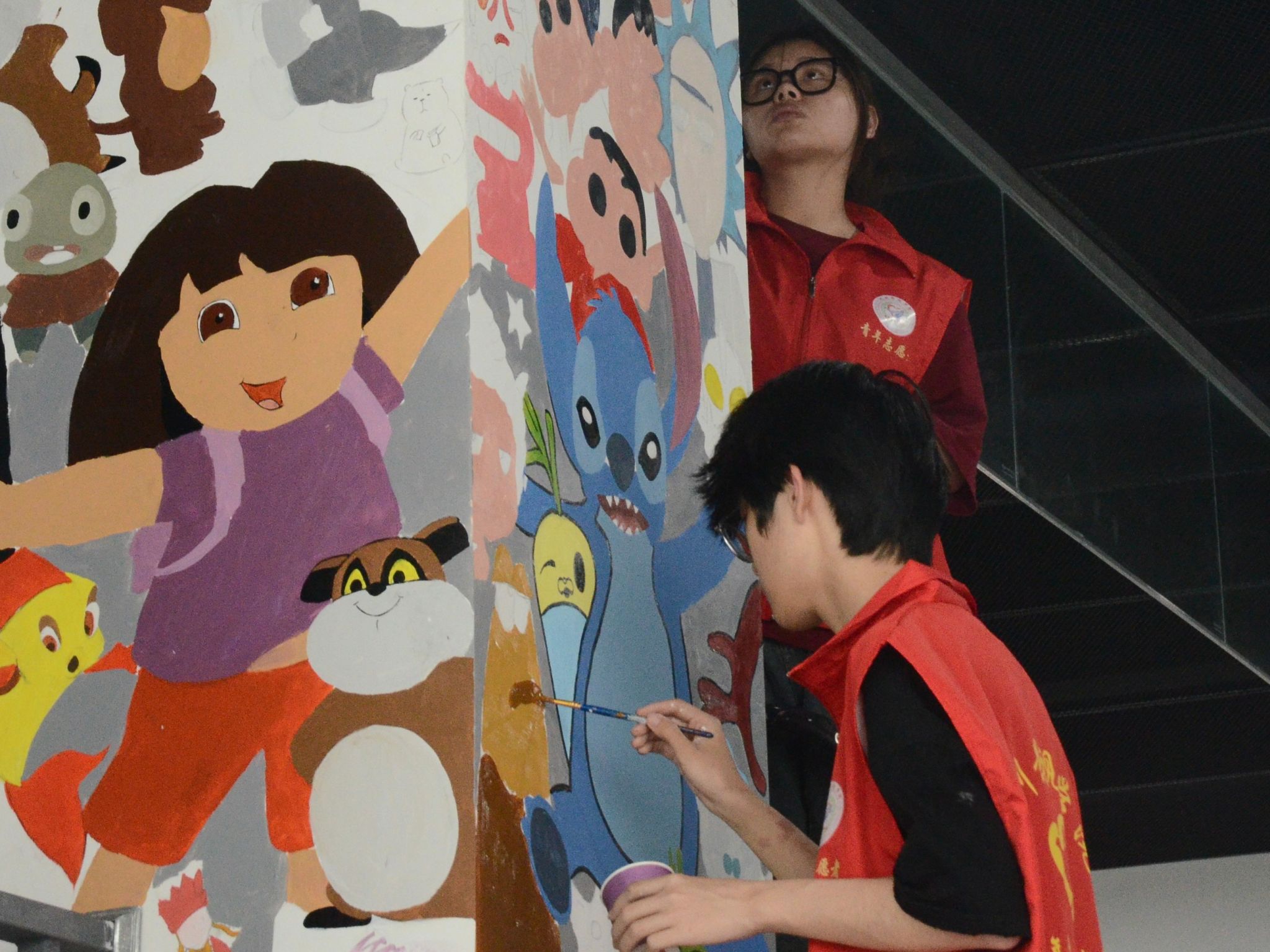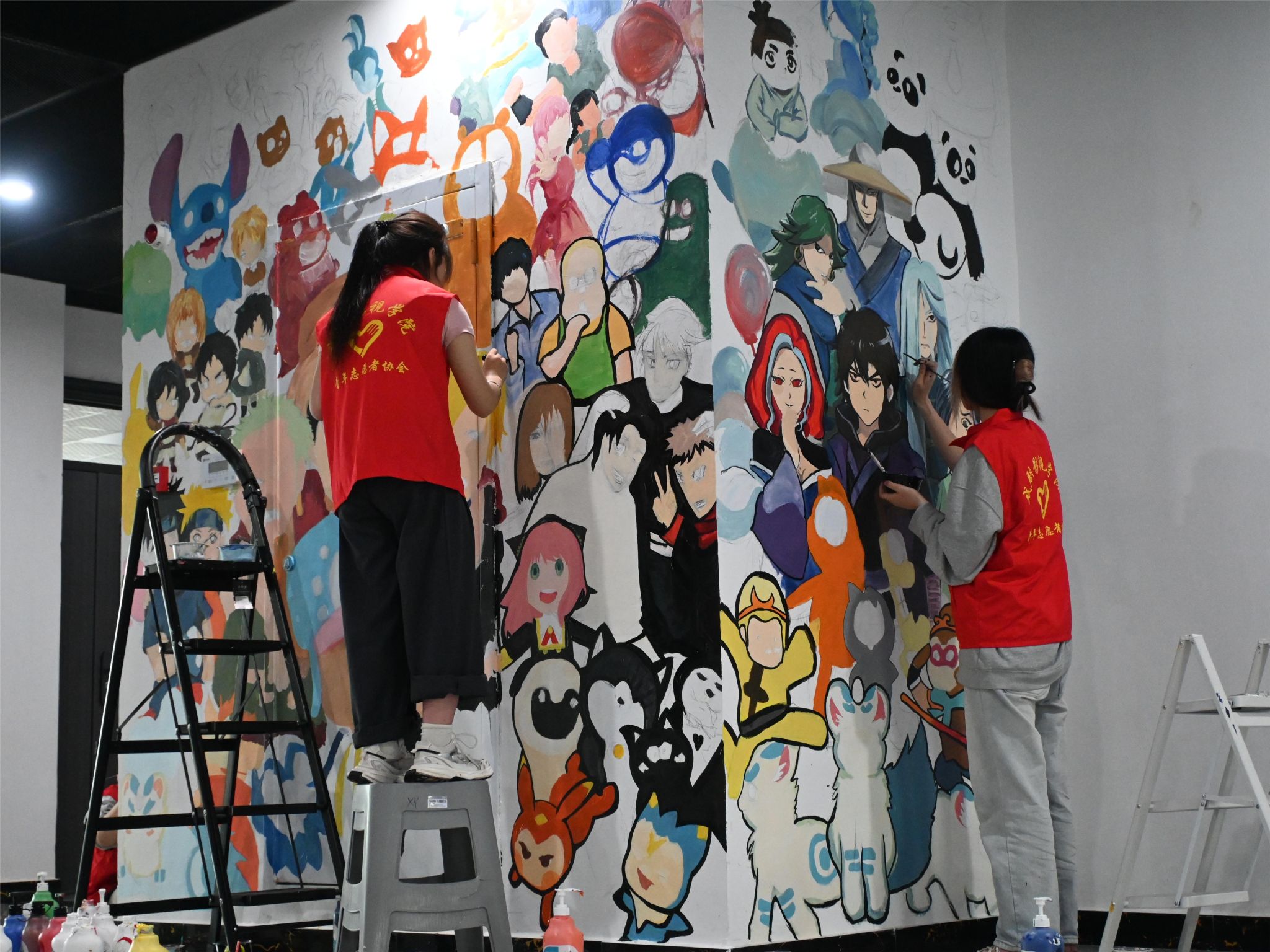 上色环节,色彩的调配与均匀涂抹也并非易事。在一次次的不断练习中,志愿者小分队们耐心尝试,选择最佳的配色方案,反复试验增加上色技巧。最后的勾线更是需要高度的专注与精准,志愿者们全神贯注,力求让画面更加清晰精致。在志愿者的画笔下,一幅幅鲜明生动的墙绘,就此诞生,为原本毫无生气的白墙注入了艺术灵气,让路过的师生都赞不绝口,让大家在潜移默化中感受艺术的熏陶。