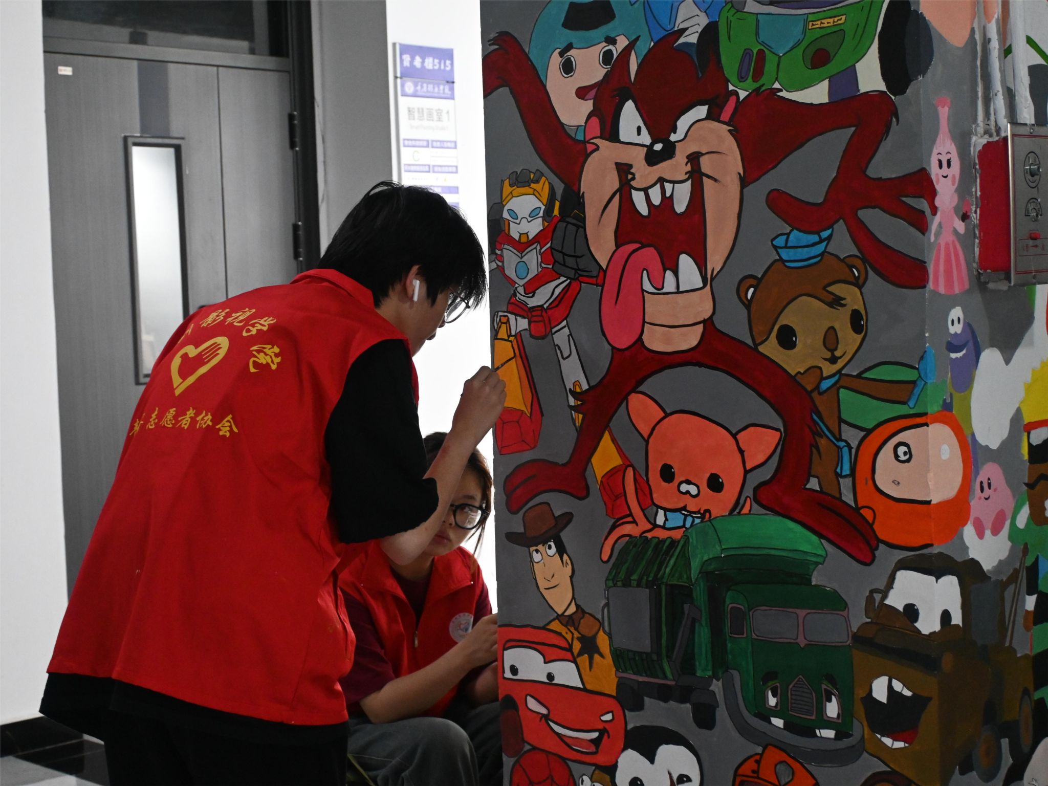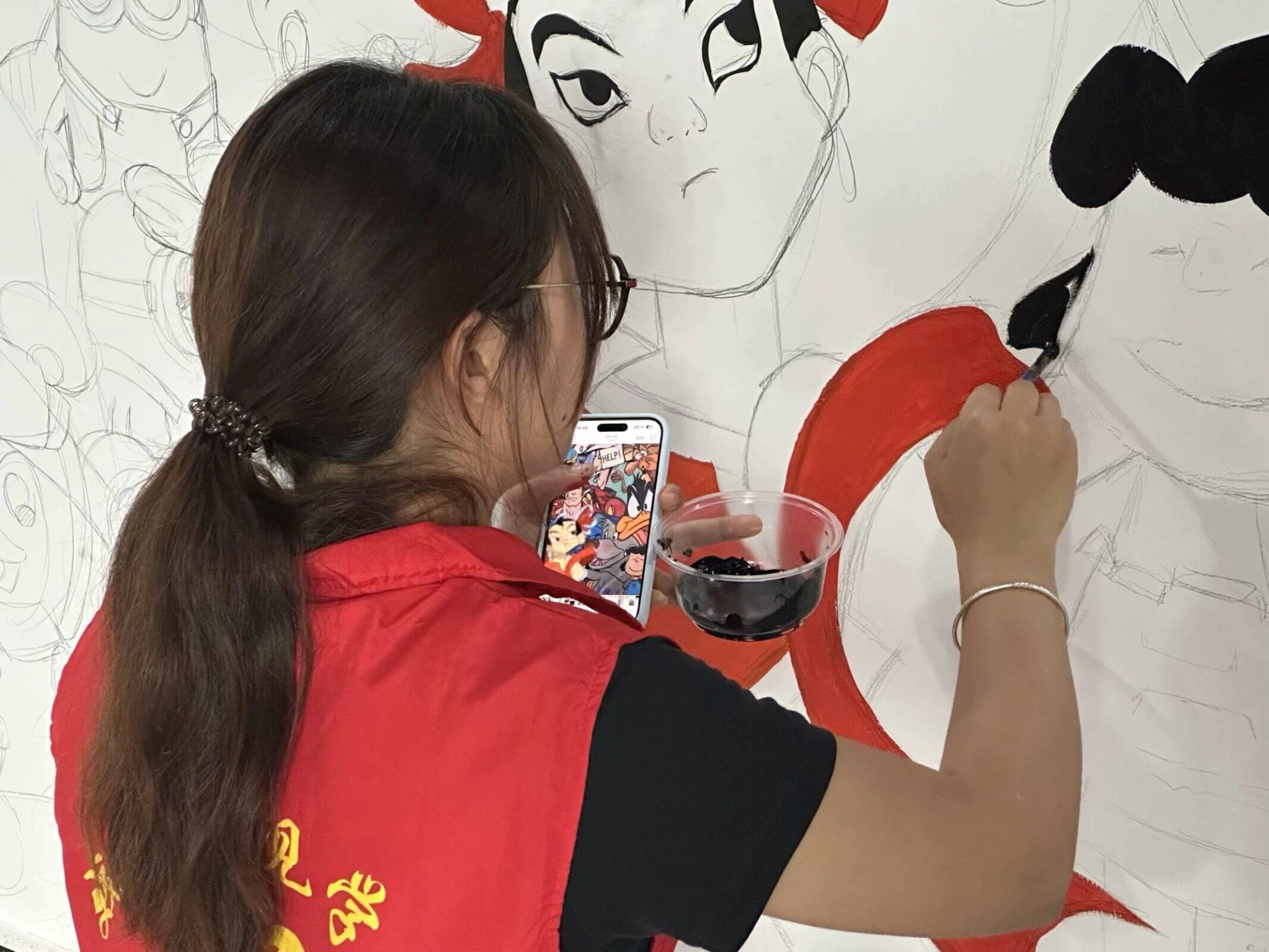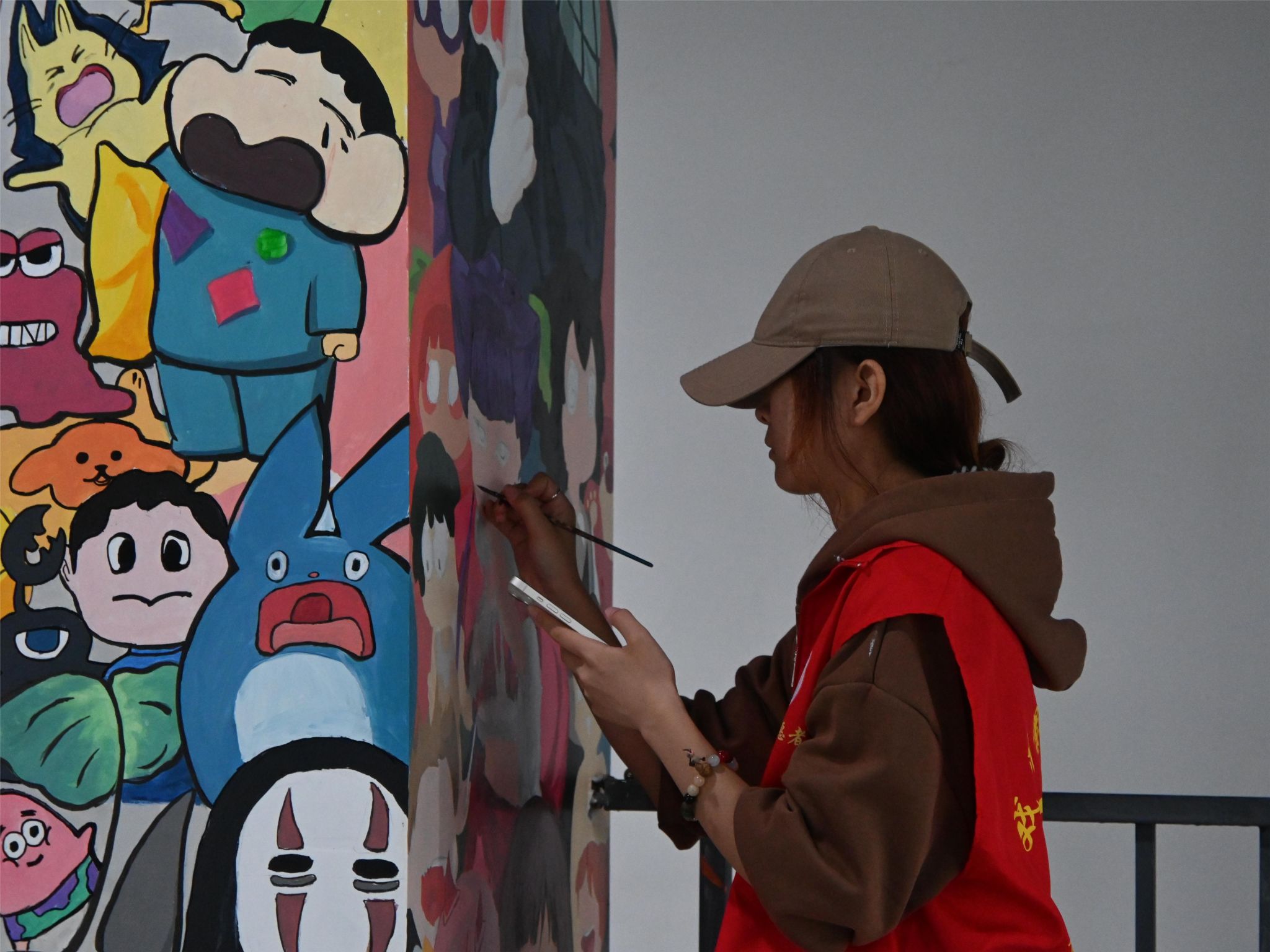 上色环节,色彩的调配与均匀涂抹也并非易事。在一次次的不断练习中,志愿者小分队们耐心尝试,选择最佳的配色方案,反复试验增加上色技巧。最后的勾线更是需要高度的专注与精准,志愿者们全神贯注,力求让画面更加清晰精致。在志愿者的画笔下,一幅幅鲜明生动的墙绘,就此诞生,为原本毫无生气的白墙注入了艺术灵气,让路过的师生都赞不绝口,让大家在潜移默化中感受艺术的熏陶。