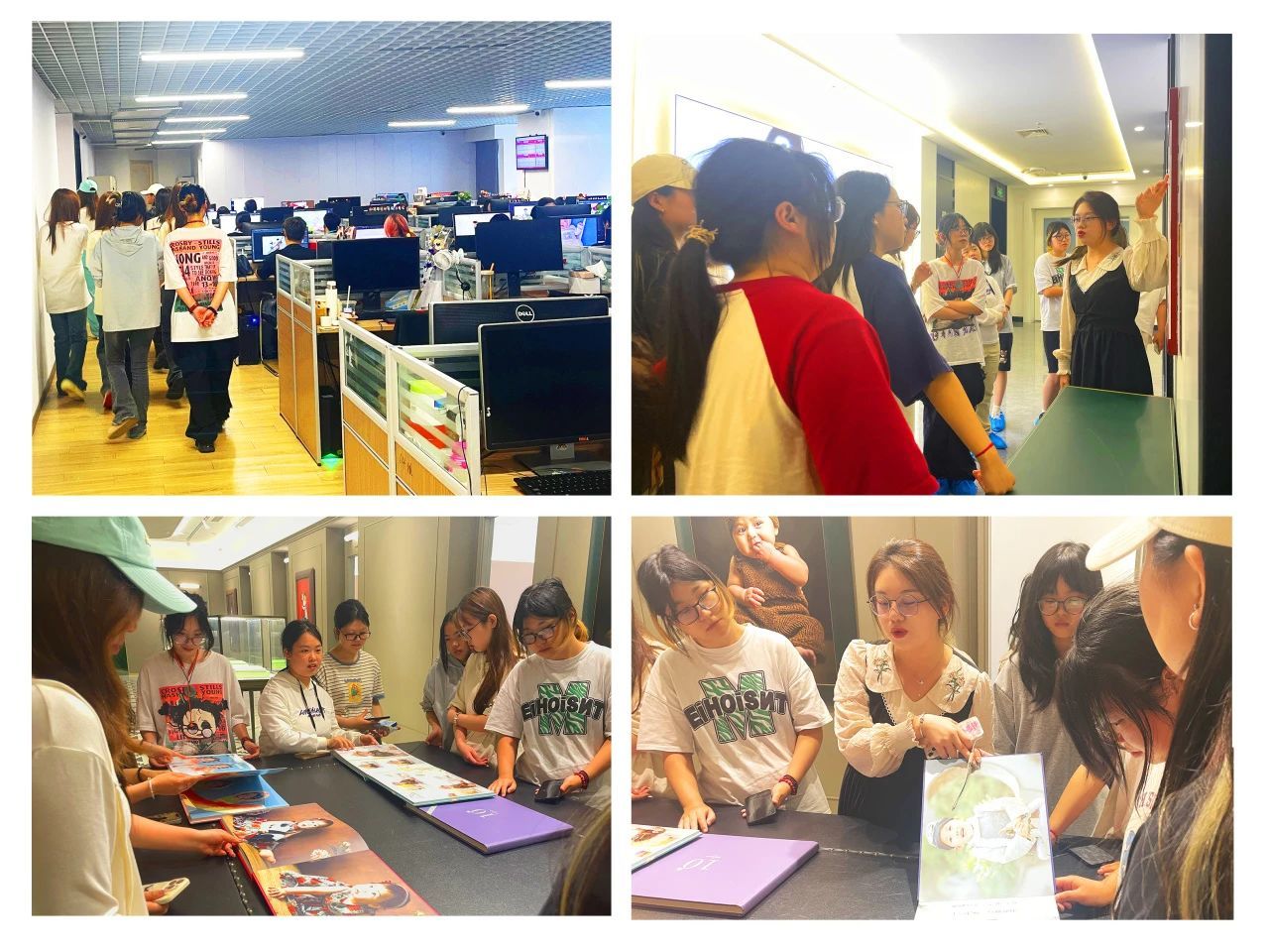 在公司校园招聘主管盛晓姣的亲切带领下,同学们逐一参观了公司的后期团队、剪辑团队、摄影棚以及营销部。每个部门都为学生们展示了其独特的专业魅力和行业前沿技术。