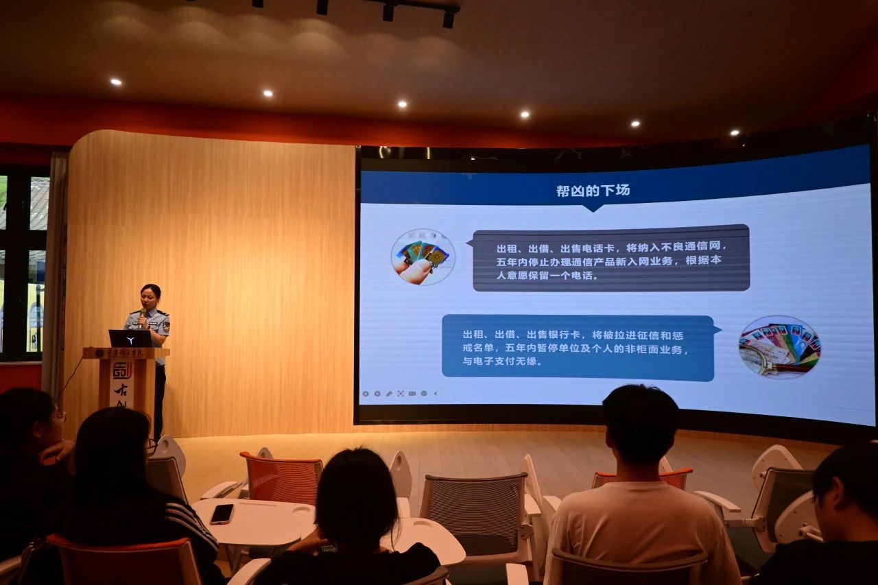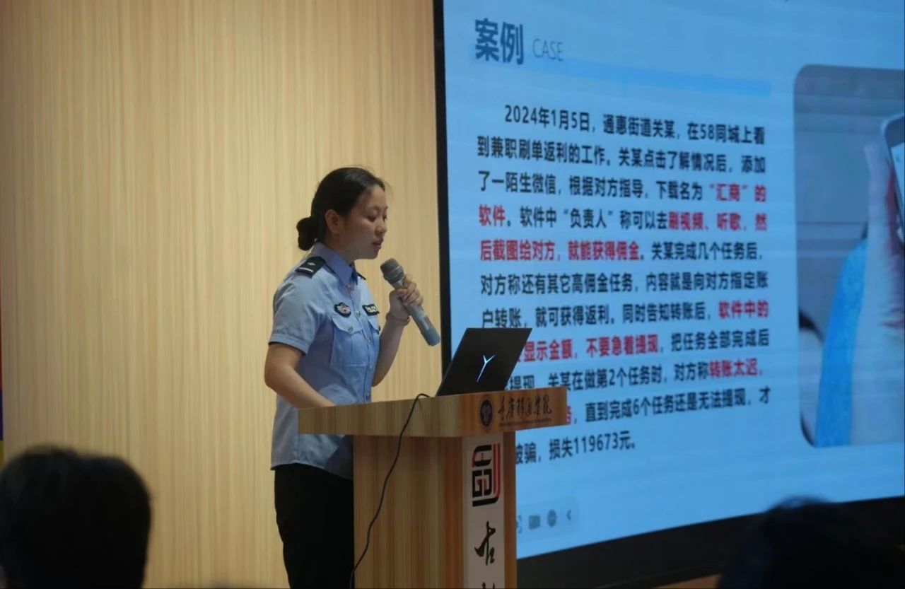 情景剧结束后,綦江区反诈中心周纯真警官为同学们带来了题为“反诈拒赌·你我同行”的反诈科普讲座,用身边最常见的真实案例剖析诈骗案件背后的险恶和黑暗。綦江区反诈中心何容容警官表示:“当前诈骗分子反侦察能力让人防不胜防,大学生是当下网络诈骗的高关注群体,一定要学习反诈知识,学会应对和分析诈骗套路。”