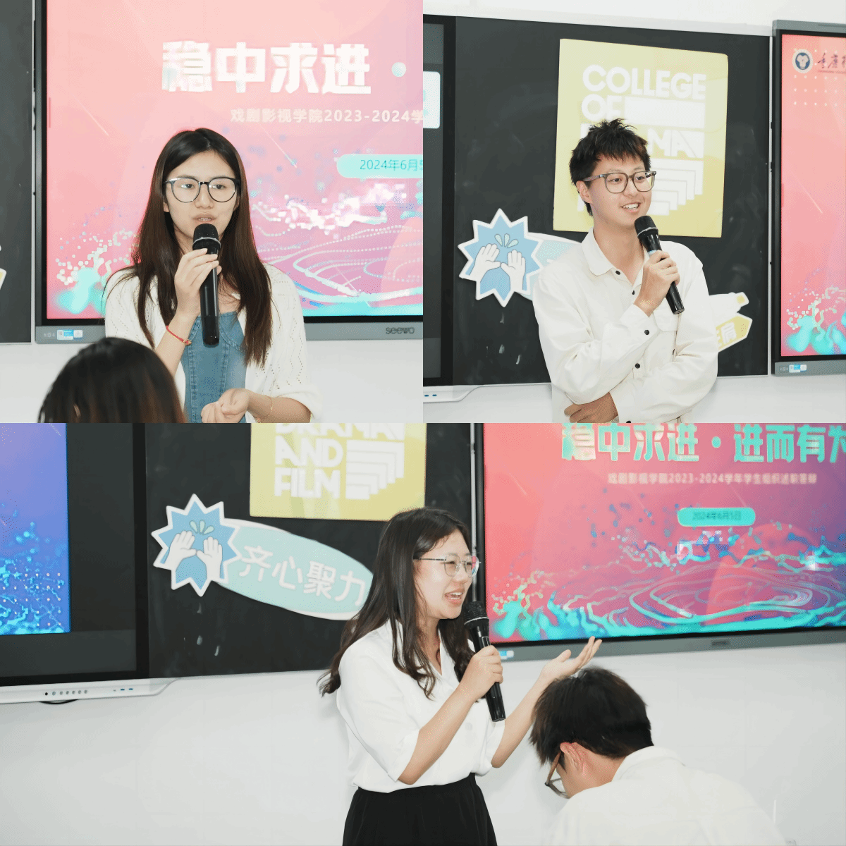 同学们分享结束后,陈玲、李梦雪、廖炳屹3位指导老师也陆续起身,对同学们表达鼓励,讲述这一学年和同学们相处的点点滴滴。李梦雪老师讲到:“指导同学们成长进步的同时,我自己也在不断突破提升,我们都在戏影慢慢成为更好的自己。”陈玲老师希望大家都能在最美的年华绽放自己最美的模样,廖炳屹老师说:“不管路有多远,不管时间多长,我都会主打一个陪伴!”最后,学工办主任曾玉娇老师用欣慰、感动和骄傲三个词语表达了这一学年学生组织的工作和成果,她讲到“同学们一点一滴、一步一步地变化、成长,就是戏娃最美的样子,就是戏影最美的样子!”