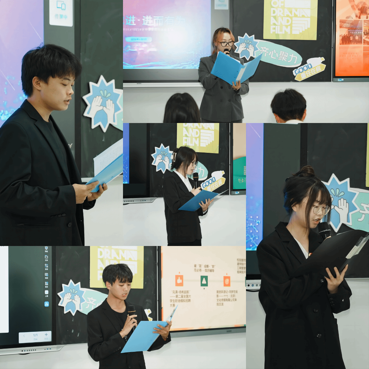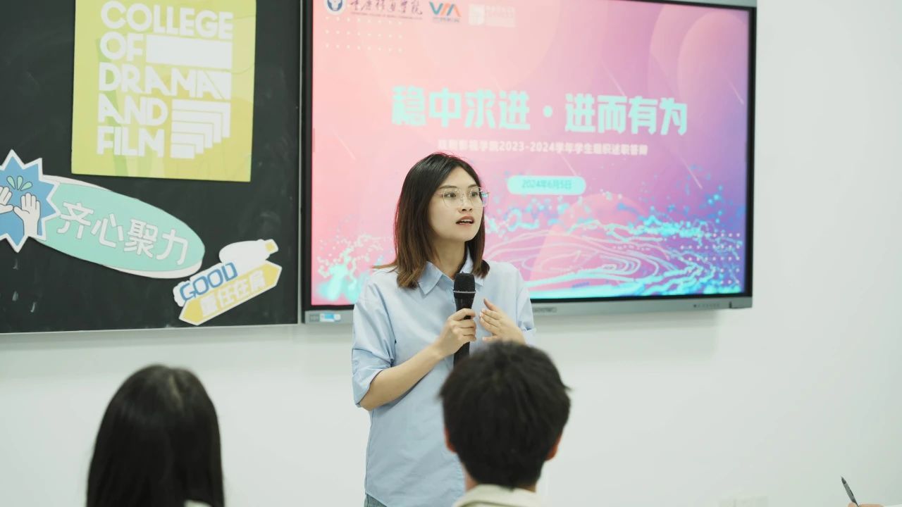为对学生组织工作进行阶段性回顾,总结我们的成果与经验,为未来的工作提供宝贵的参考和坚实的基础。6月5日晚19:00,学院在贤者楼502教室举行了“稳中求进·进而有为”——戏剧影视学院2023-2024学年学生组织述职答辩大会。学工办主任曾玉娇老师、辅导员陈玲、李梦雪、廖炳屹三位指导老师,学生组织各部门干部干事们汇聚一堂,共同回顾过往、总结经验、展望未来。