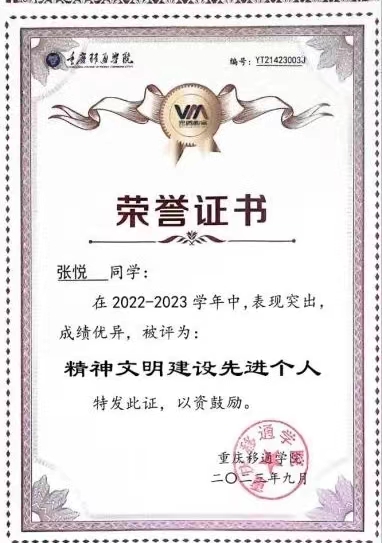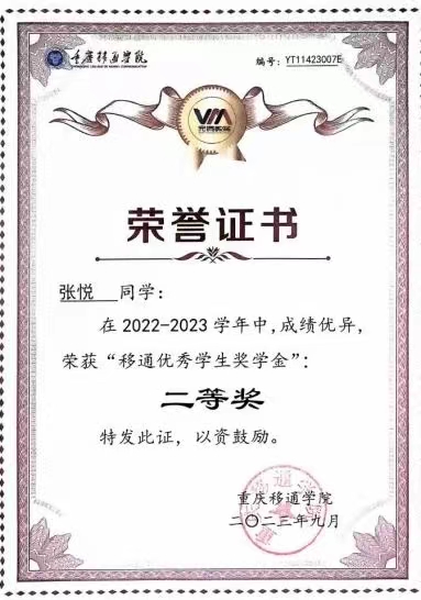 张悦,共青团员,戏剧影视学院2022级动画4班学生,綦河书院学生。现任戏剧影视学院一届一任学生组织执行主席,曾任戏剧影视学院青年志愿者协会干部、2022级动画4班团支部书记、戏剧影视学院2023级班导师。荣获2022—2023学年国家励志奖学金、重庆市志愿服务先进个人、2023年度綦江区最美志愿者、重庆移通学院2022—2023学年“优秀学生奖学金二等奖”、钓鱼城影评海报设计大赛二等奖、青年志愿者先进个人、精神文明先进个人、“三下乡”先进个人、“返家乡”优秀个人、百名优秀志愿者等20余项荣誉。