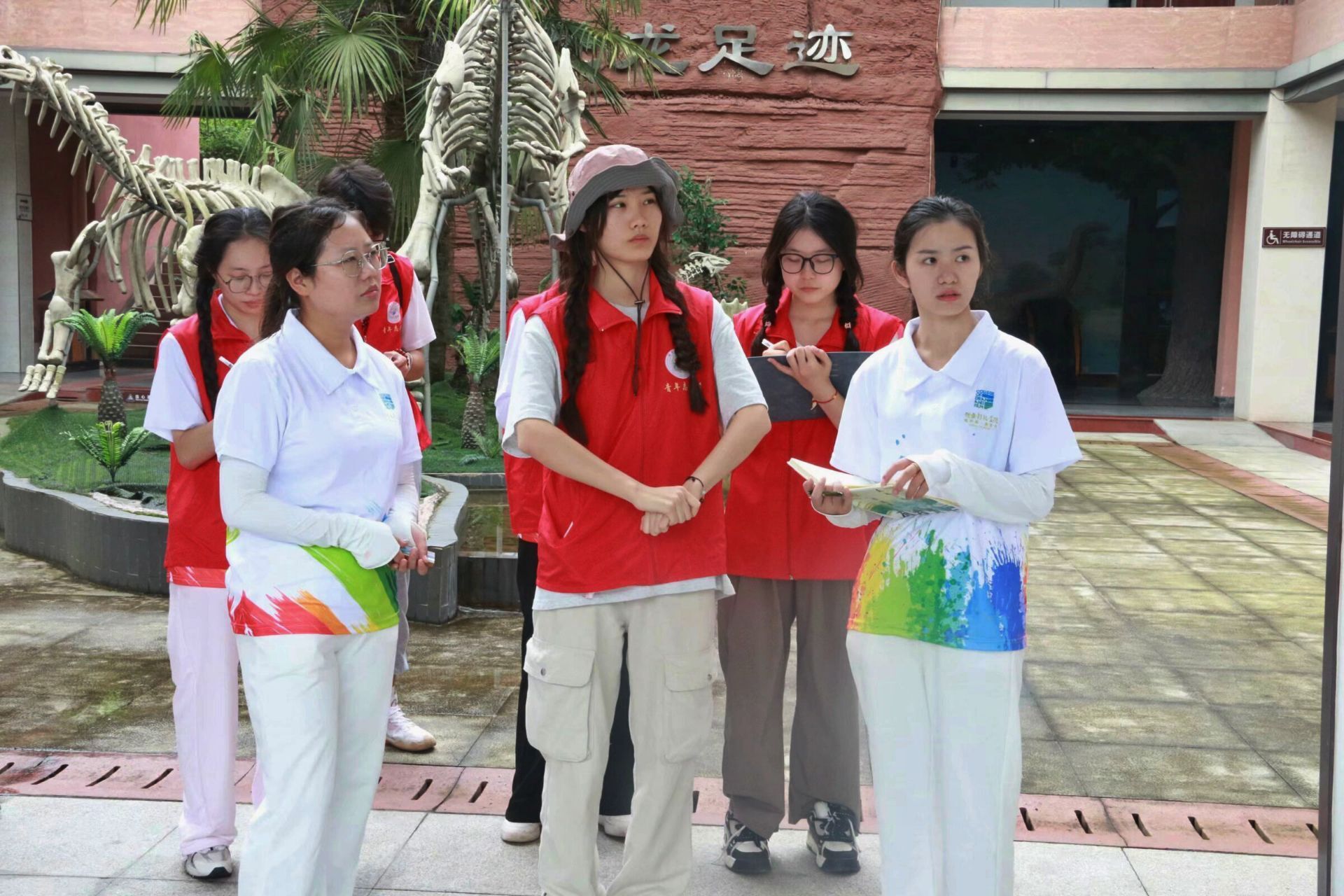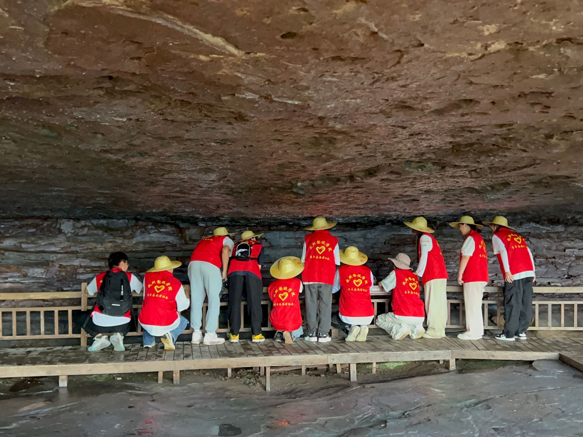 志愿者们按照行程安排前往老瀛山红岩坪,进入科普中心,先后参观了恐龙化石、恐龙足迹等文化遗址。志愿者们认真学习记录着展板陈列的文字资料,志愿者们通过实地走访调研与相机记录的方式,了解恐龙足迹和丹霞地貌的形成。红岩坪的实地调研,让志愿者们更进一步了解了红岩村的地质文化底蕴,为后续挖掘地质文化故事,形成完整绘本故事奠定基础。