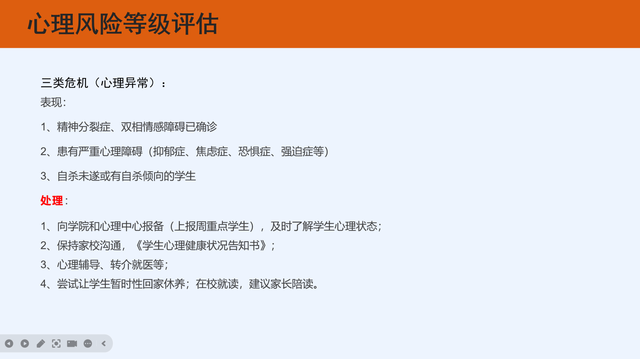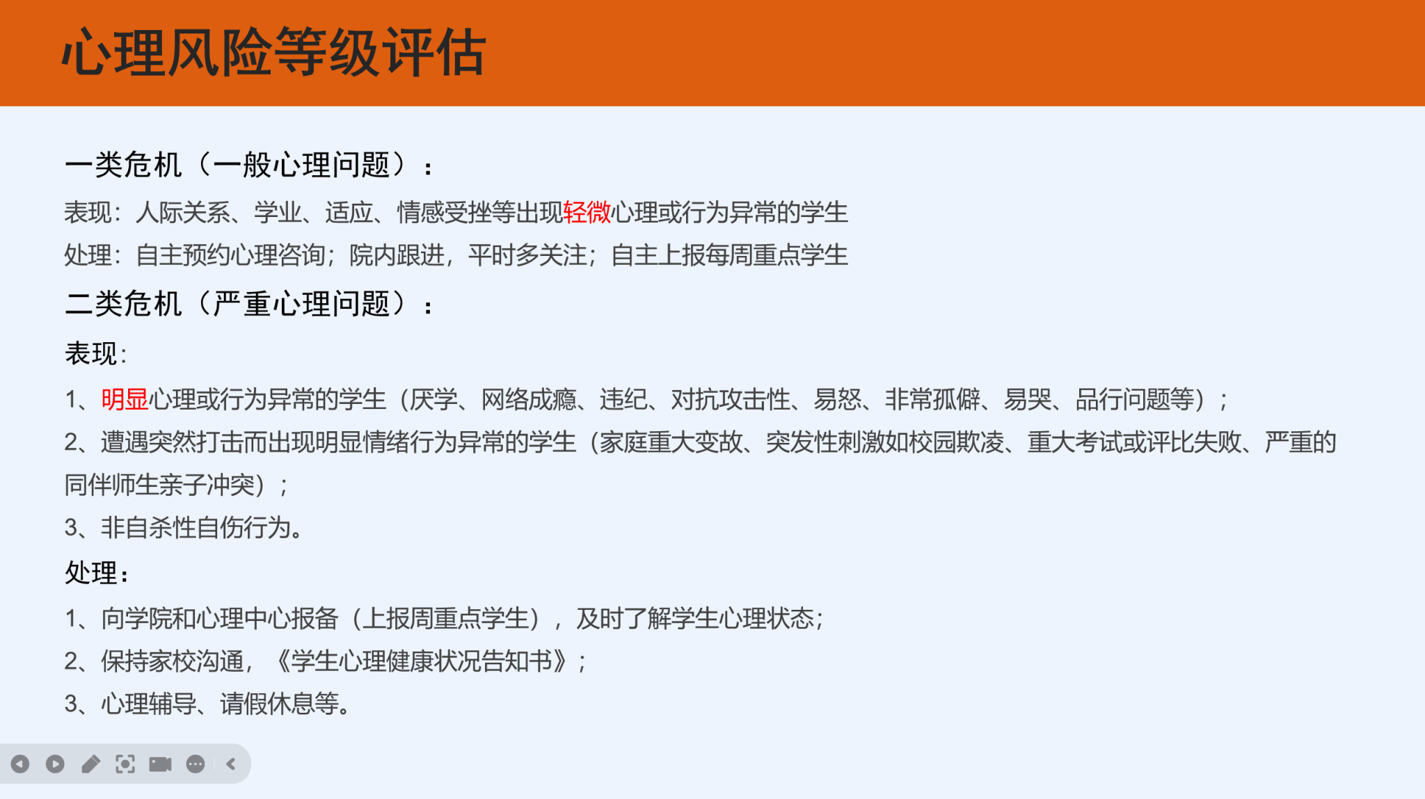 心理委员在班级中扮演着至关重要的角色,接下来,为了深入了解心理委员的职能,由戏剧影视学院心理委员负责人岳莉针对心理委员的工作职责进行培训。首先介绍了学院身心发展部的指导老师及执行主席和部长。紧接着讲解了心理委员的工作职责、如何组织班级心理健康主题活动和落实学校安排的心理健康教育工作任务。最后对于如何为出现心理危机的同学提供心理支持、发现存在心理危机和心理问题的同学等多个方面进行培训。心理委员们以及身心发展部各干事对自身的工作职责有了更进一步的学习,对他们未来的工作起到了重要推动作用。