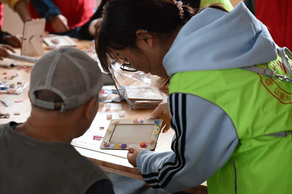 与此同时,在相框制作区域,另一批志愿者正向老人们展示着各式材料的奇妙用途,以及如何将它们巧手组合成一个个独具匠心的相框。他们耐心细致地讲解每一个步骤,鼓励老人们发挥想象力与创造力,亲手打造属于自己的个性相框。在制作过程中,老人们分享着自己过往的故事与回忆,与志愿者们建立起深厚的情感联系。每一个精心制作的相框,都不再仅仅是一个装载照片的容器,而是成为了承载老人们珍贵回忆、见证幸福时光的宝贵艺术品。