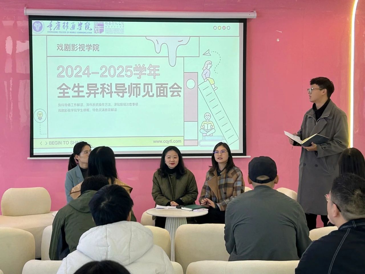 异彩纷呈展戏韵,影梦交织绘长卷。为深入贯彻我校“教师双院制”育人举措,进一步加强异科导师与学院、书院之间的紧密联系,力促异科导师全面深入了解戏剧影视学院的特色风貌与戏影学子风采,戏剧影视学院于11月19日在丁山书院天秤座·朋辈交流中心开展了异科导师见面会暨方案解读会。戏剧影视学院王芳副院长、学工办主任曾玉娇老师、团总支书记邓艳老师、郑诗昱老师、廖炳屹老师以及戏剧影视学院全生异科导师参加会议。此次会议旨在明确异科导师的工作职责,解读相关政策与实施方案,促进导师间的交流与合作,共同为学生的全面发展贡献力量。
