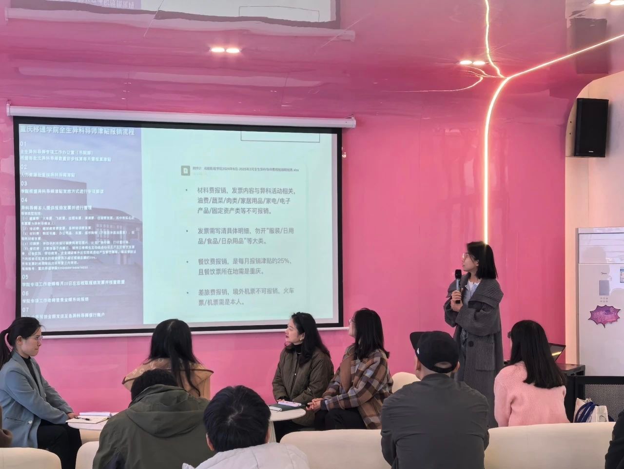 团总支书记邓艳老师向与会异科导师介绍了“戏影完满”活动。希望通过丰富多彩的校园活动,提升学生的综合素质,培养学生的团队合作精神和社会责任感。邓老师鼓励异科导师积极参与其中,充分发掘学生特点,为学生的成长搭建更多平台。