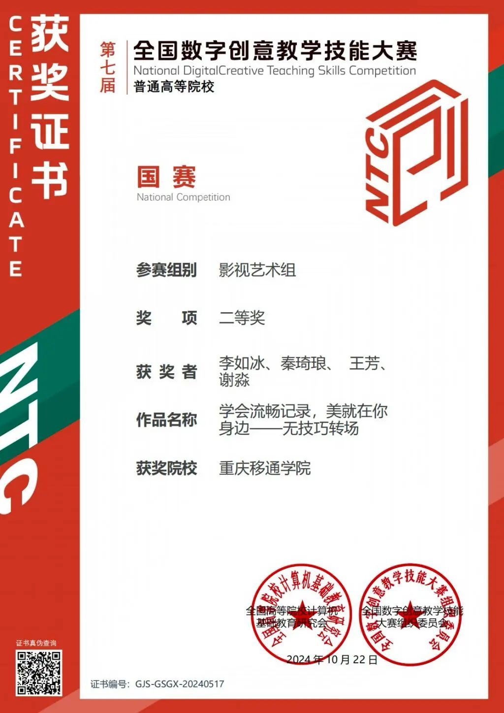 重庆移通学院戏剧影视学院的教师团队创作的微课作品《学会流畅记录,美就在你身边》在第七届全国数字创意教学技能大赛中荣获全国二等奖。此项赛事是教育部公布的全国普通高校教师教学竞赛榜单中的重要赛事,并被收录于《全国普通高校教师教学竞赛分析报告》中。因其规模宏大、参与院校众多,在高校教师技能大赛中占据着举足轻重的地位。此次获奖,是学校“内涵建设与质量提升主题年”成果展现,也是戏剧影视学院紧抓应用型教育初心不改,以赛促学实干落地的重要体现。同时,戏剧影视学院一贯提倡教学相长、师生共进的育人理念,积极推动教师参与各类学科竞赛,以保证教师团队始终处于行业发展前端。