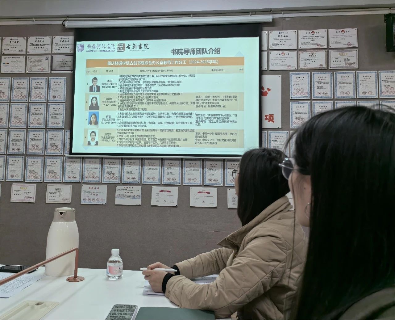 会议在轻松而热烈的氛围中拉开帷幕。首先,古剑书院学生发展导师刘思含为与会人员详细介绍了古剑书院的基本情况。她指出,古剑书院不仅汇聚了一支资深导师团队,还配备了完备的学习与生活设施,并通过丰富多彩的特色活动,成功营造出温馨的家园氛围。紧接着,她还概述了书院入住学生的概况。随后,戏剧影视学院双院融合专岗教师廖炳屹详细阐述了学工教师团队的基本情况。他详细介绍了每位老师的分工情况和工作范畴,使与会者对双方的教师团队有了更加全面的了解。这一环节不仅增进了双方教师之间的了解,更为后续工作的开展提供了便利。