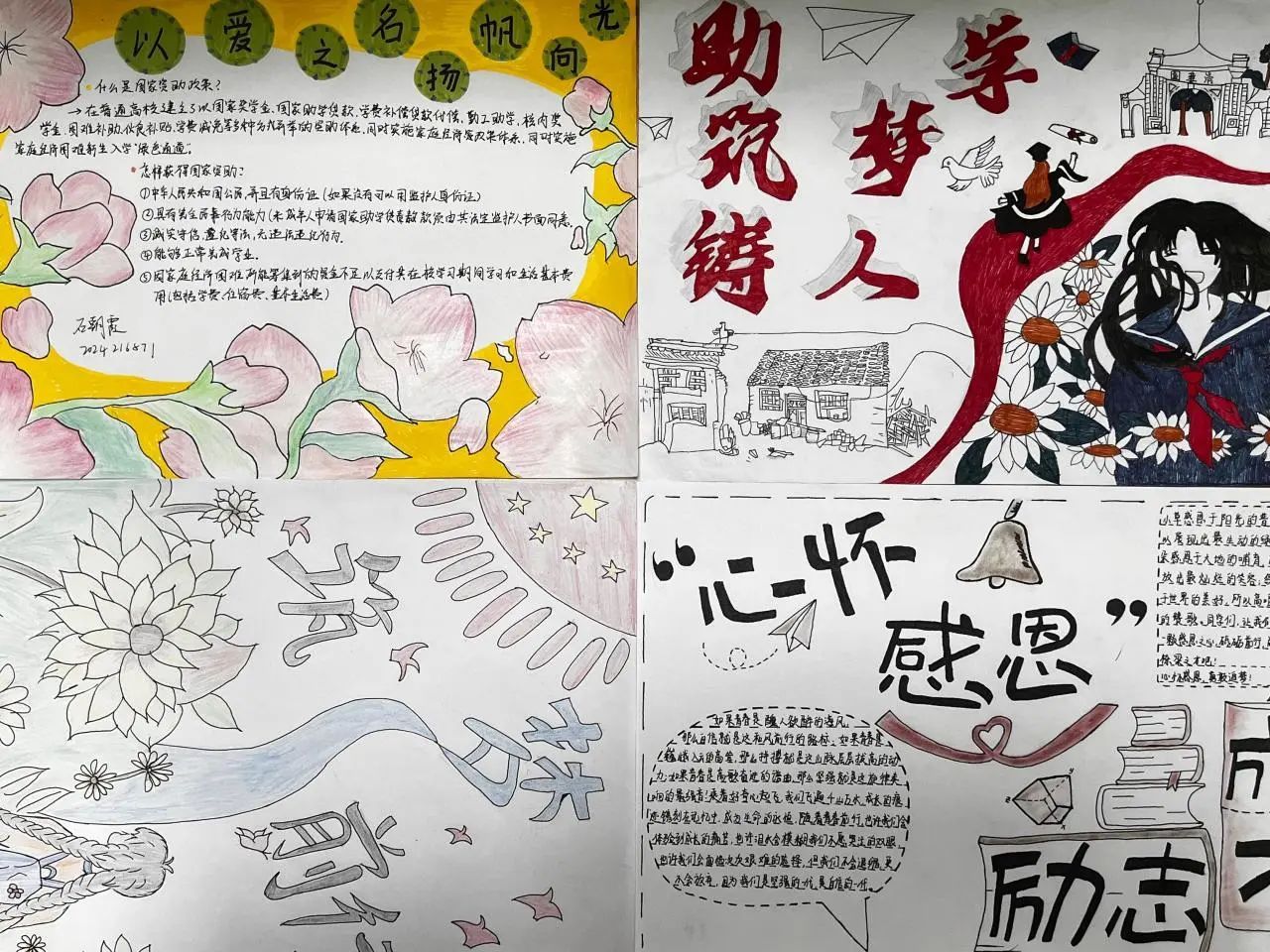 在活动期间,同学们参与热情高涨,踊跃投稿,共收集到各类作品达 160 余件。每一件作品都凝聚着同学们的心血,也承载着他们对于资助育人这一主题独特的理解与感悟。手抄报作品共计37件,它们宛如一幅幅匠心独运的绚丽画卷,满载着深厚而真挚的情感与信息。这些作品以工整隽秀的文字、精致细腻的插画,或深刻解读国家资助政策的内涵,或生动展现资助所带来的巨大影响,或深情抒发受助者的感恩之心。无论是画面布局还是文字表述,都深切地流露出参与者对资助的珍视与感激之情,以及资助在他们成长历程中所镌刻下的不可磨灭的印记。