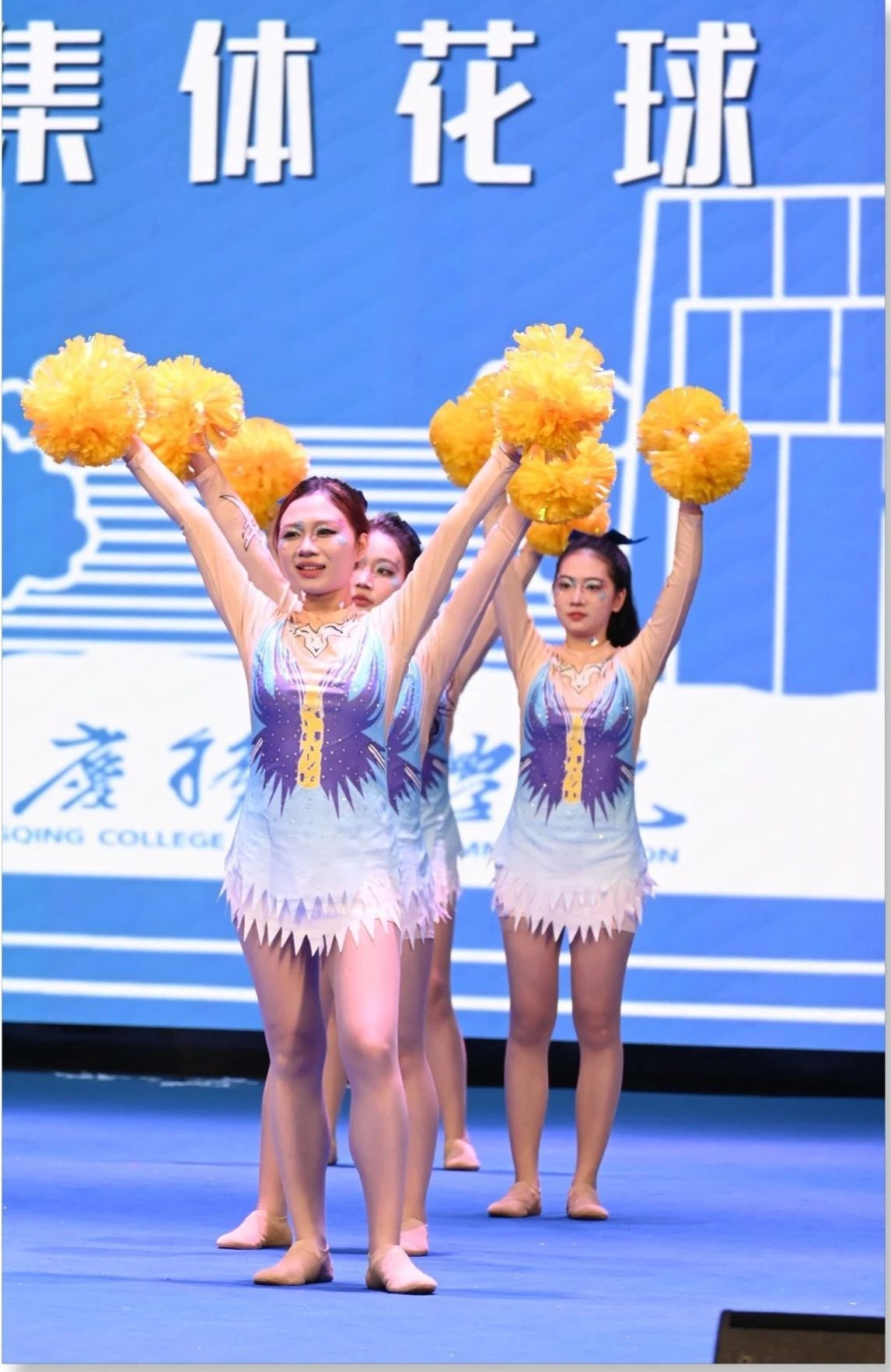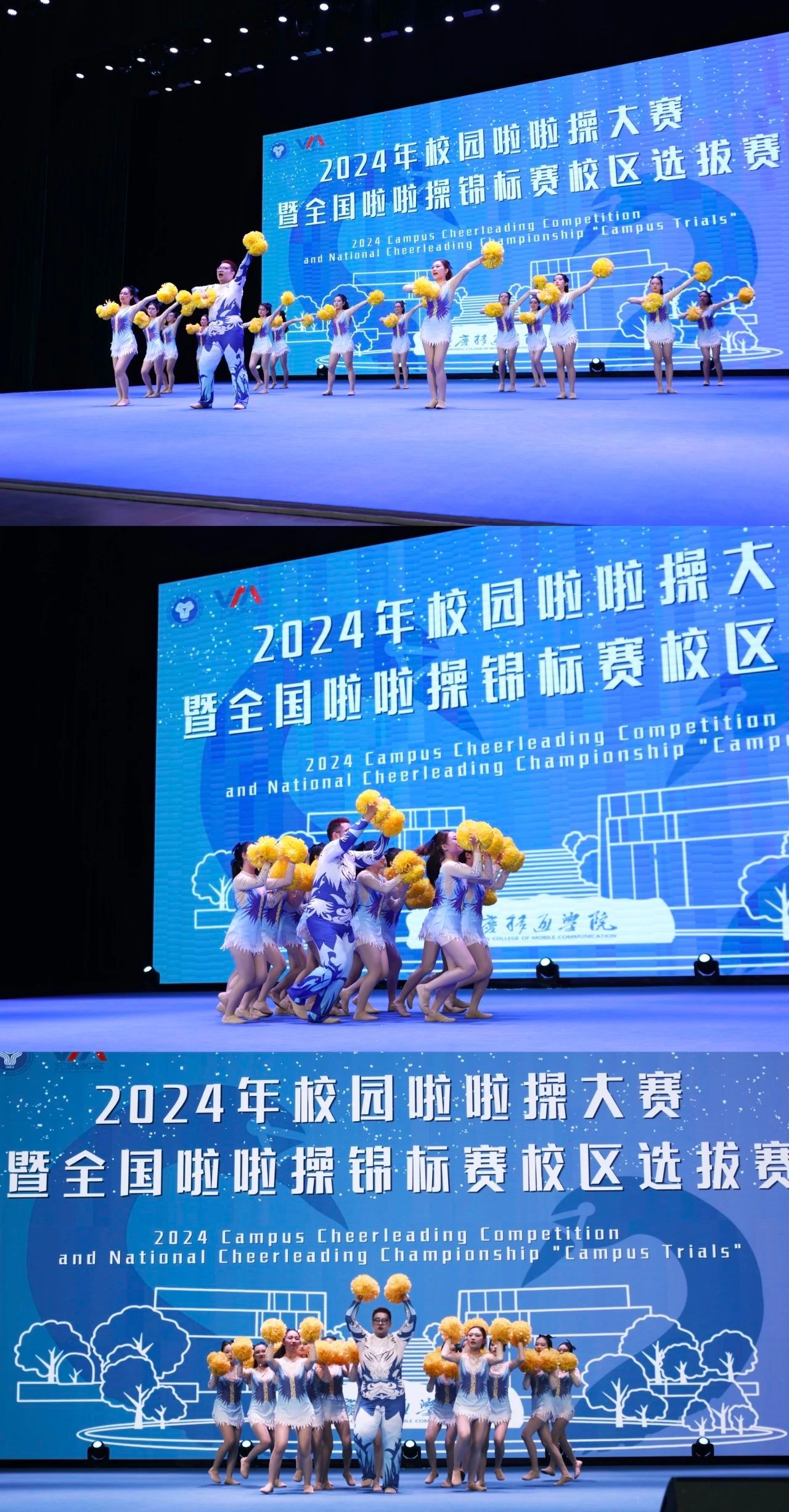 随之而来的便是大家期待已久的集体啦啦操花球表演,16名队员心有灵犀,他们身着绚丽的表演服装,手持色彩斑斓的花球,脸上洋溢着热情的笑容,精神抖擞地步入赛场。观众席,来自戏剧影视学院师生声嘶力竭的加油呐喊声响彻了整个大剧院。他们奋力举起表演学生的姓名手举牌,情不自禁的从座位站起、或不停晃动着手中的加油牌,尖叫声、掌声,此起彼伏。其中李政昌同学,灵活的身姿更是成为了整个队伍的焦点,引起观众的阵阵欢呼。队员们整齐划一的动作、富有感染力的笑容点燃了整个赛场的气氛。他们每一次跳跃、旋转、欢呼都彰显着团队的默契与凝聚力。最终获得最佳编排奖,无疑为他们日夜的辛苦排练画上了圆满的句号。