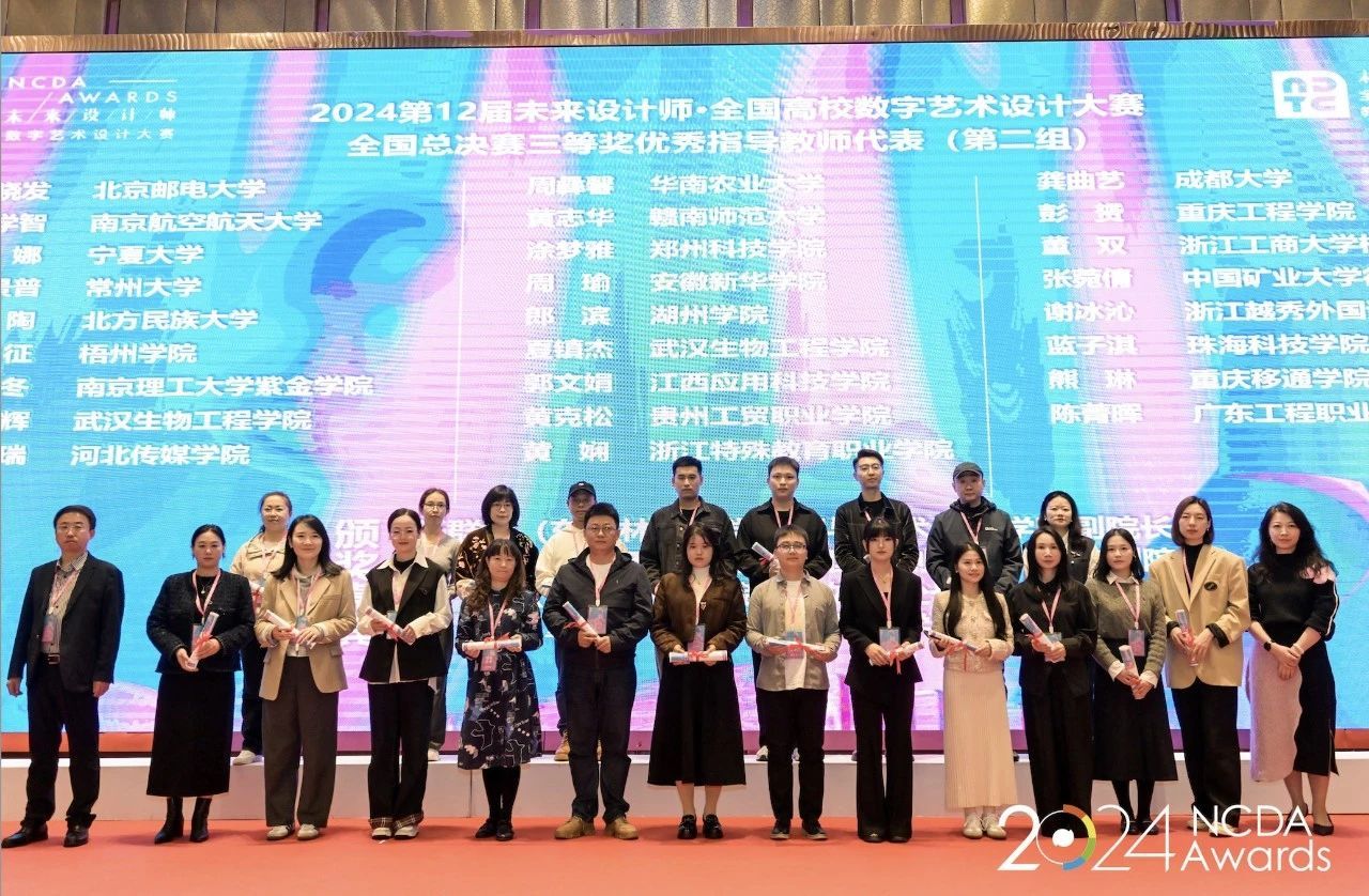 此外,在全国高校数字艺术设计大赛(NCDA)赛道中,戏剧影视学院因其出色的组织能力和学生的优异表现获得2024第12届未来设计师·全国总决赛优秀组织单位奖,李如冰副教授获优秀组织教师奖;熊琳老师凭借其丰富的教学经验和专业的指导能力指导作品获评优秀指导教师代表;学生夏荷林获国家级三等奖,王琳、莫中雪、舒晶琴、胥小蕊分获省部级二等奖及省部级三等奖。戏剧影视学院王芳副院长作为颁奖嘉宾,为优秀指导教师颁发了荣誉奖项。